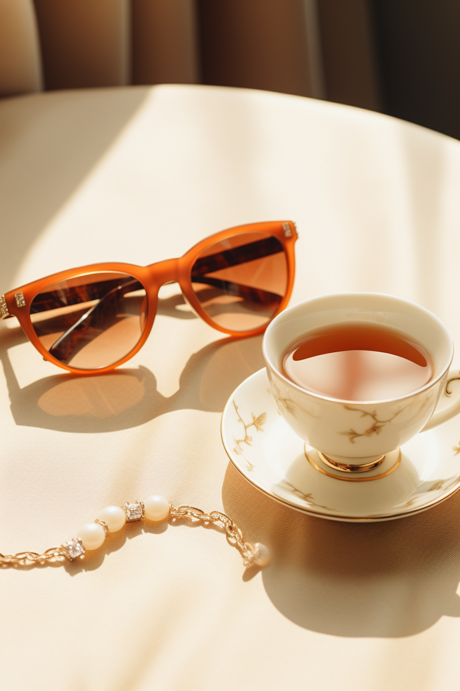 Tranquil Elegance: Sunglasses, Teacup, and Bracelet Still Life