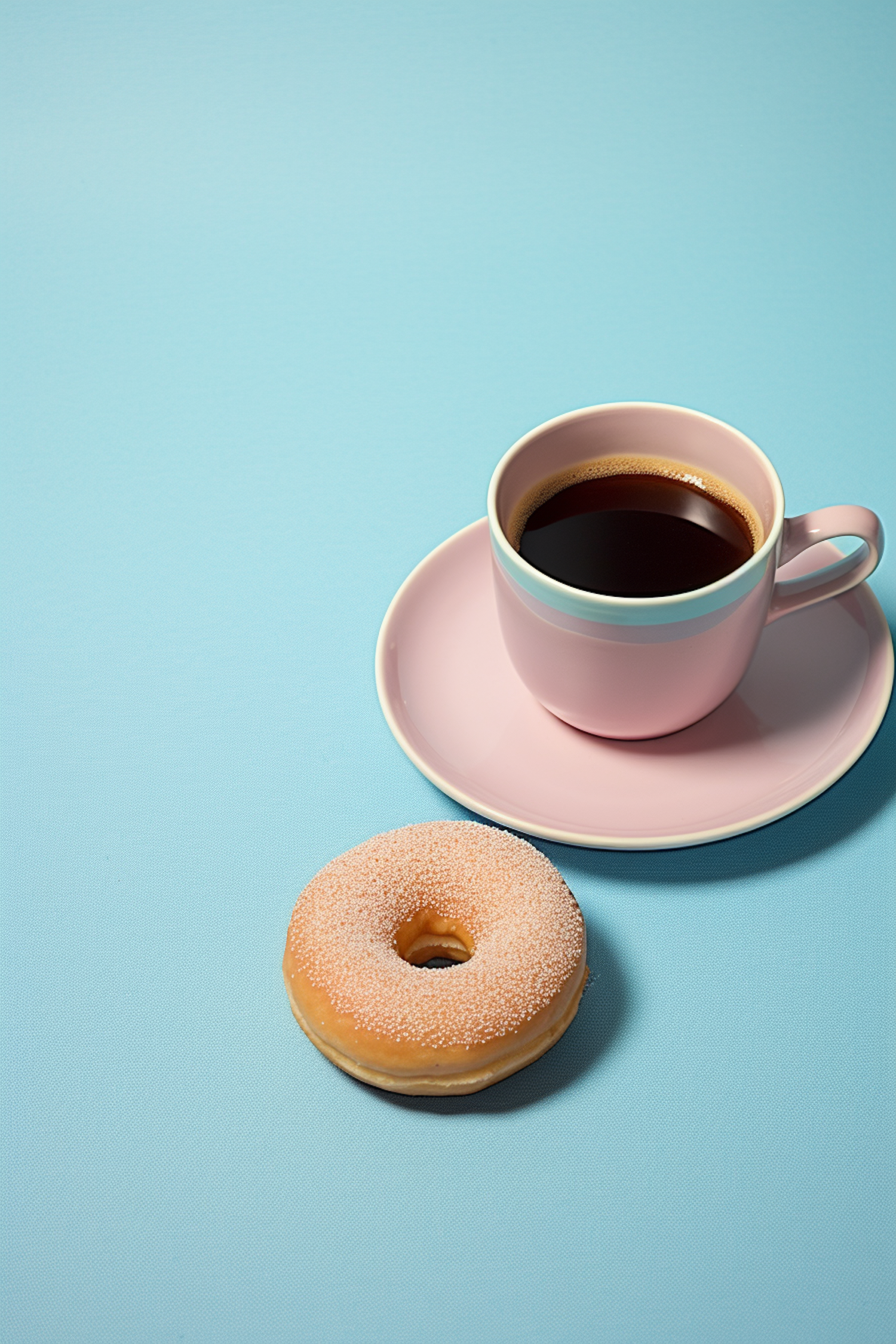 Pastel pink cup of coffee with a sugar-coated donut on a light blue background. Simple and elegant breakfast scene.
