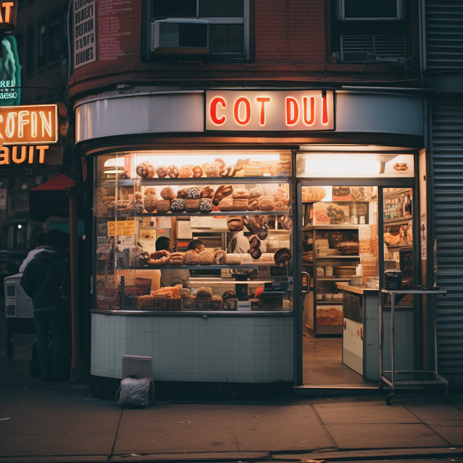 Warmly lit bakery with 'COT DUI' neon sign, showcasing fresh bread and pastries in a vintage-style glass display at night.