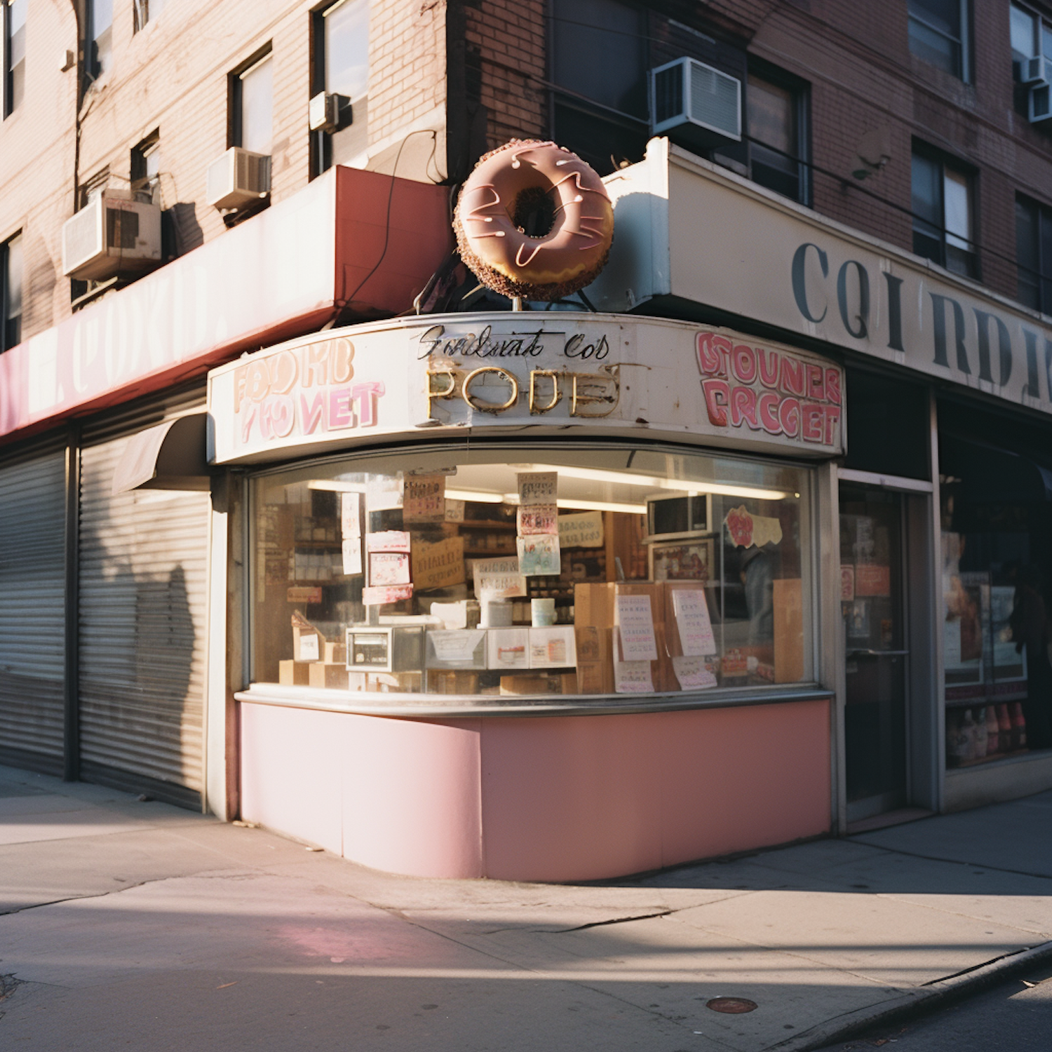 Vintage donut shop with a large donut sign, pink and cream facade, and retro signage in warm afternoon light.