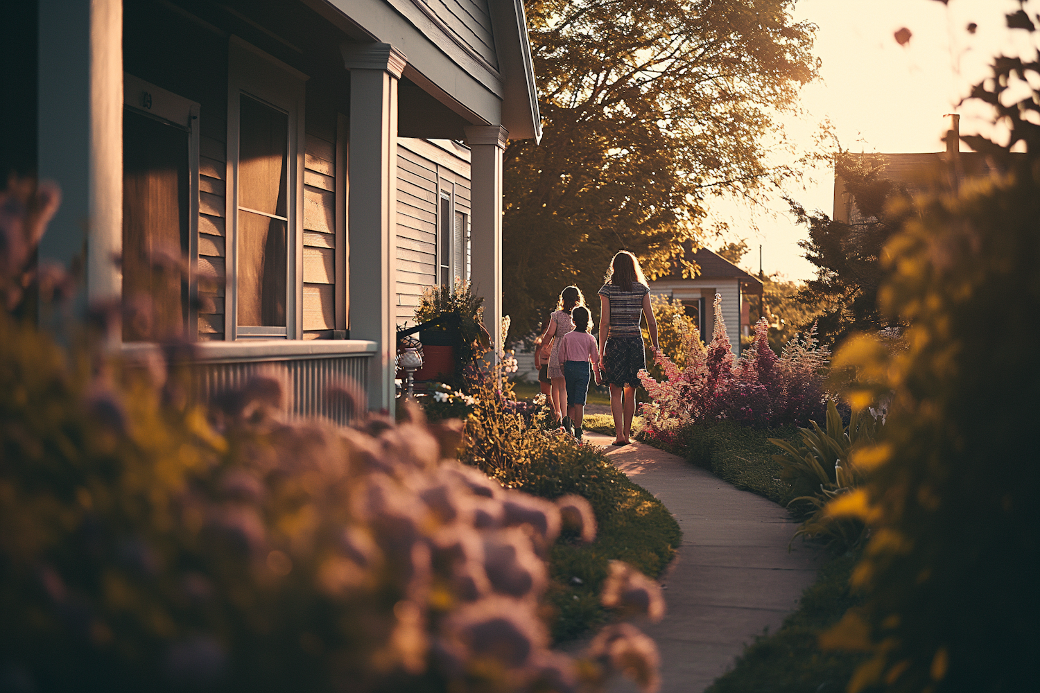 A woman and two children walk along a sunlit path beside a house, surrounded by blooming flowers and a warm sunset glow.