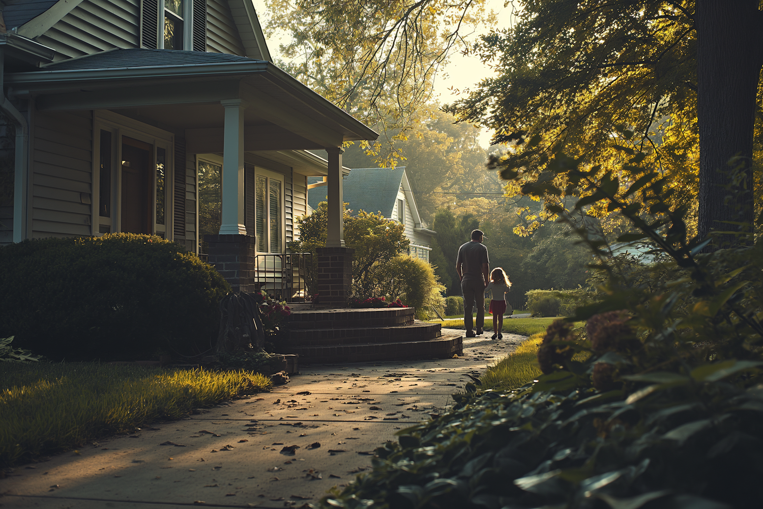 Father and daughter walk hand in hand on a sunlit suburban sidewalk, surrounded by lush greenery and warm, golden light.