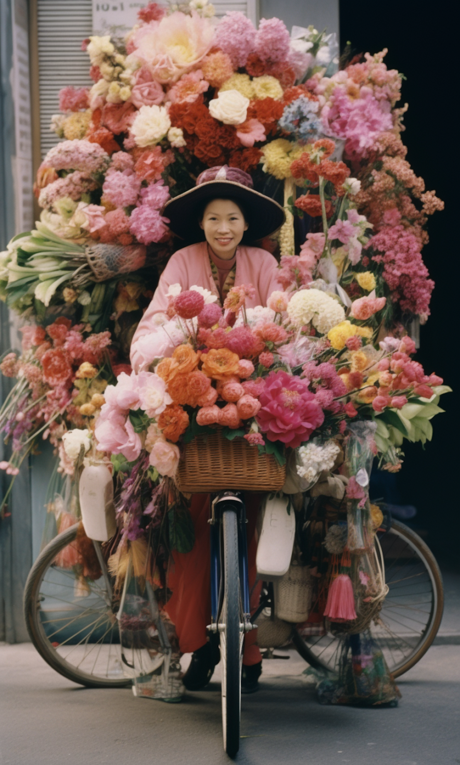 A woman on a bicycle surrounded by vibrant flowers, wearing a wide-brimmed hat and pink outfit, smiles warmly in an urban setting.