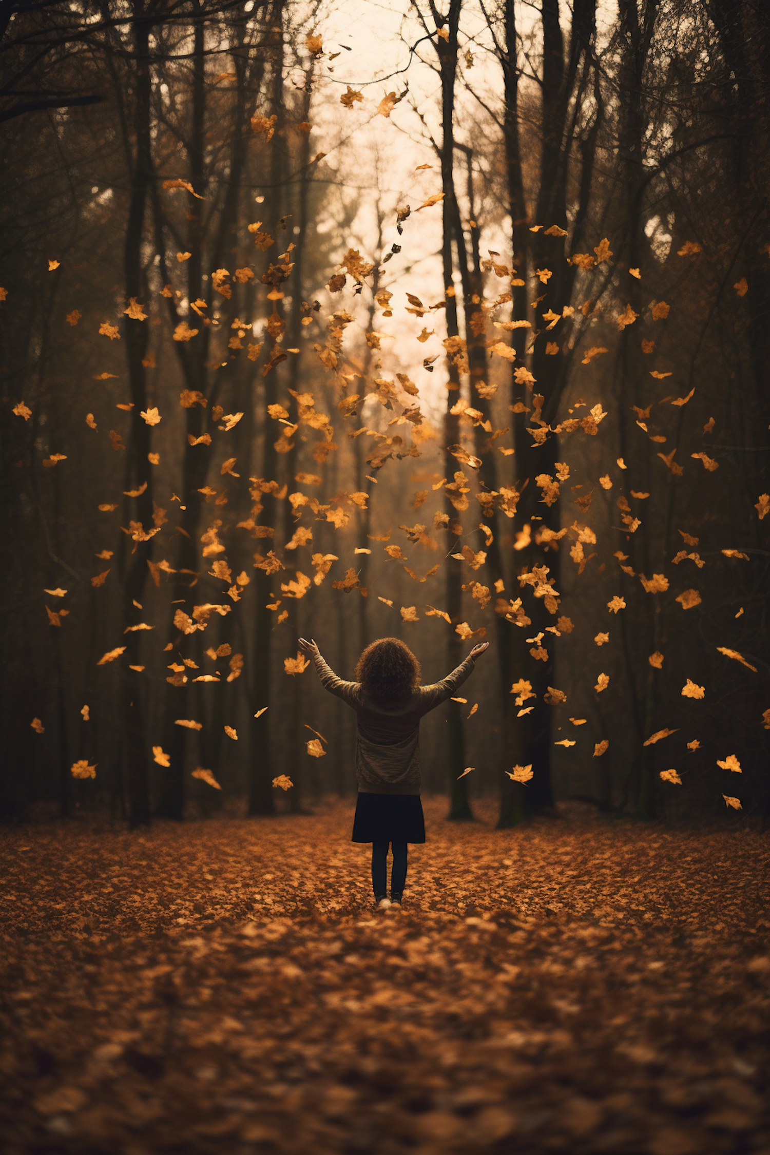 A person with curly hair stands in a forest, arms outstretched, surrounded by falling autumn leaves in a serene, golden-lit scene.