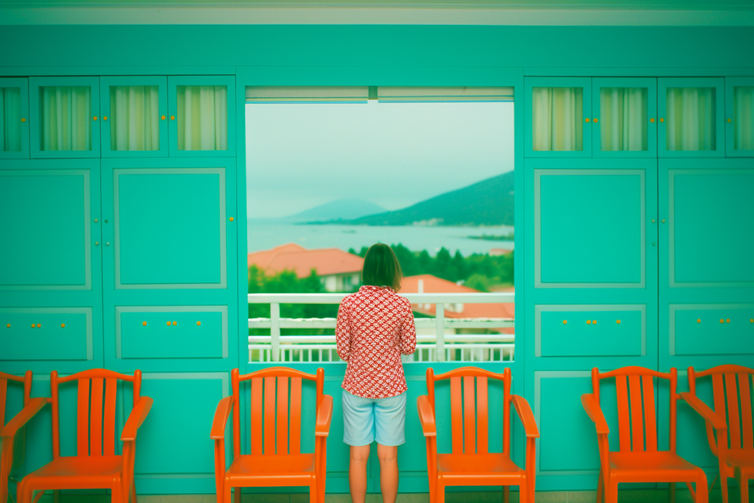 Person on a turquoise balcony with orange chairs, overlooking a scenic coastal view with red-roofed buildings and green hills.