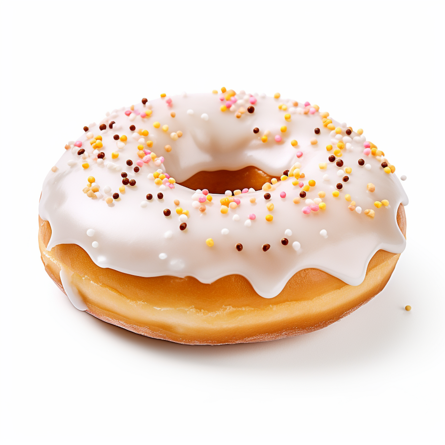 Delicious donut with white icing and colorful sprinkles on a bright white background.