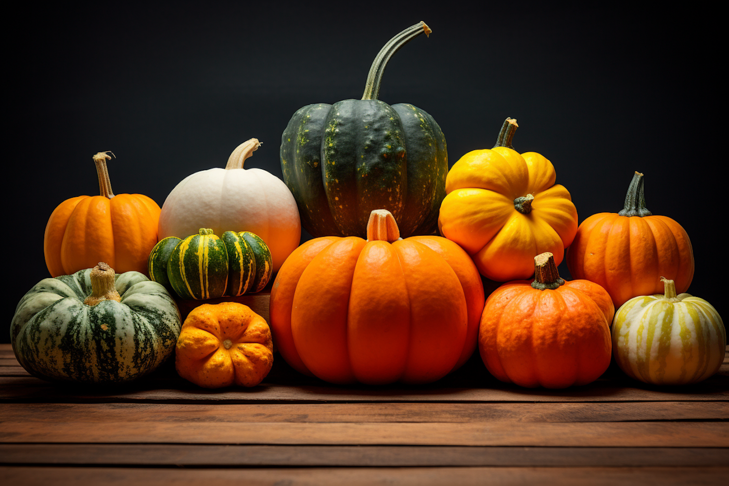 A vibrant assortment of pumpkins and gourds in various colors and shapes on a wooden surface, perfect for autumn decor inspiration.