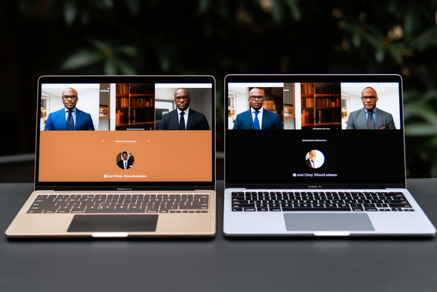 Two laptops side by side displaying a video call with a man in a suit. One laptop is gold, the other silver, with different background colors.
