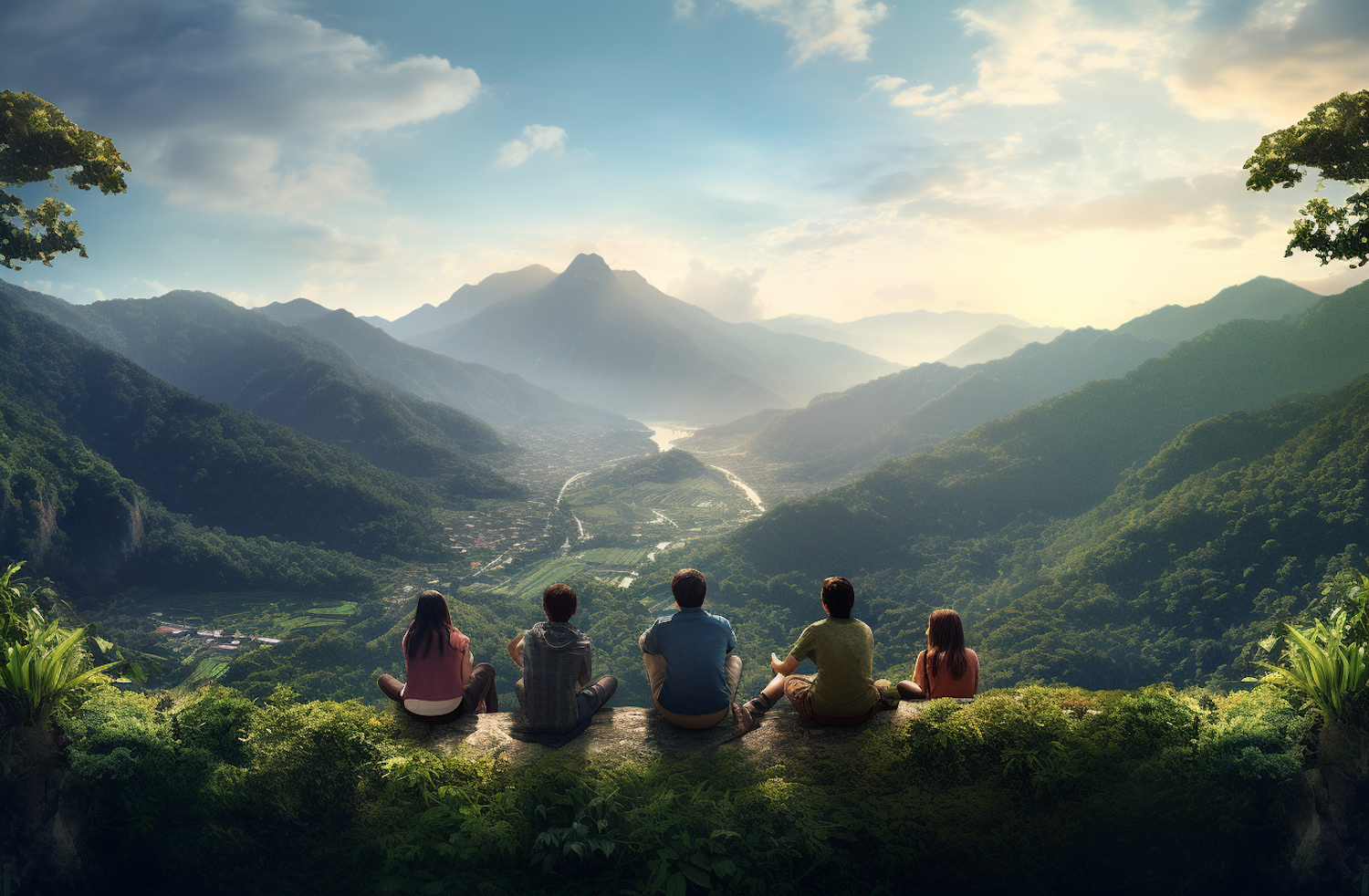 Five friends enjoy a stunning mountain valley view with lush greenery, a winding river, and a serene golden sky.