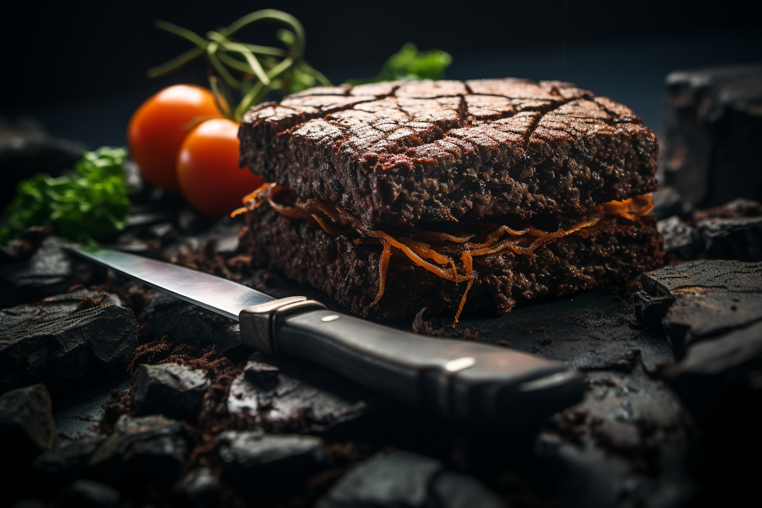 Dark bread sandwich with orange filling on a rocky surface, accompanied by tomatoes and a knife, creating a rustic scene.