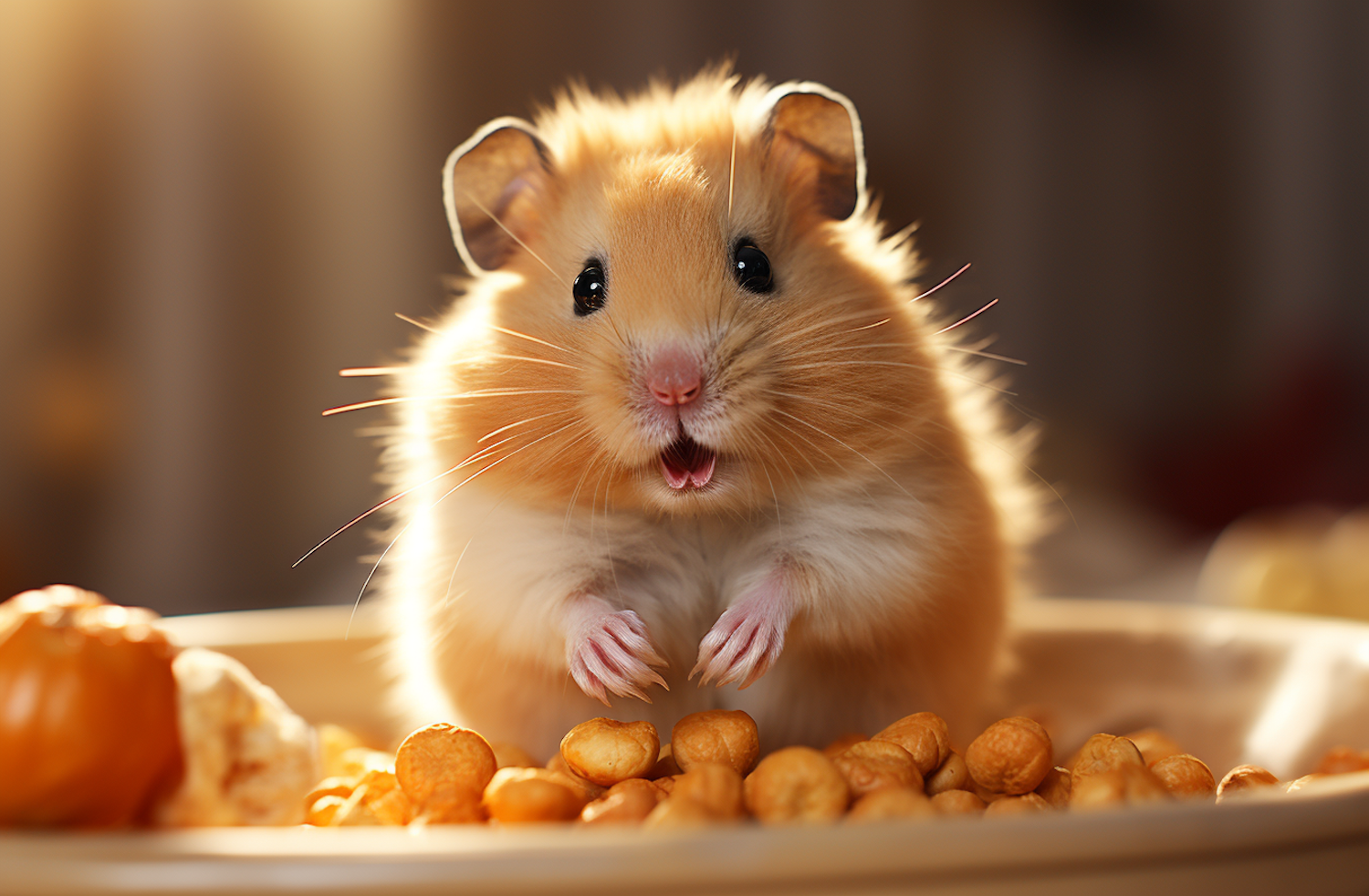 Adorable golden hamster with fluffy fur enjoying snacks in a warm, cozy setting. Perfect close-up of its curious and expressive face.