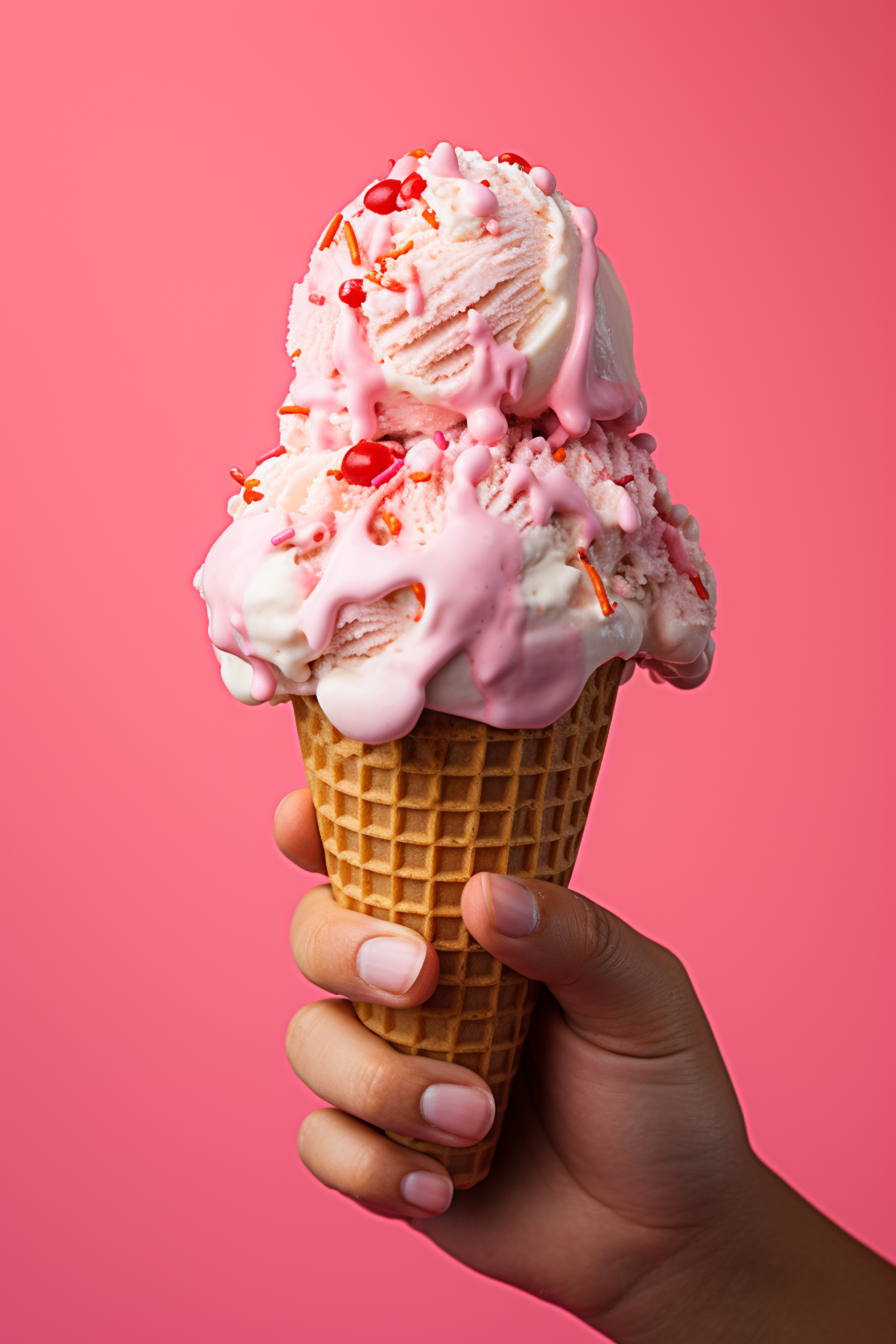 Delicious pink and white ice cream cone with sprinkles and syrup against a vibrant pink background.