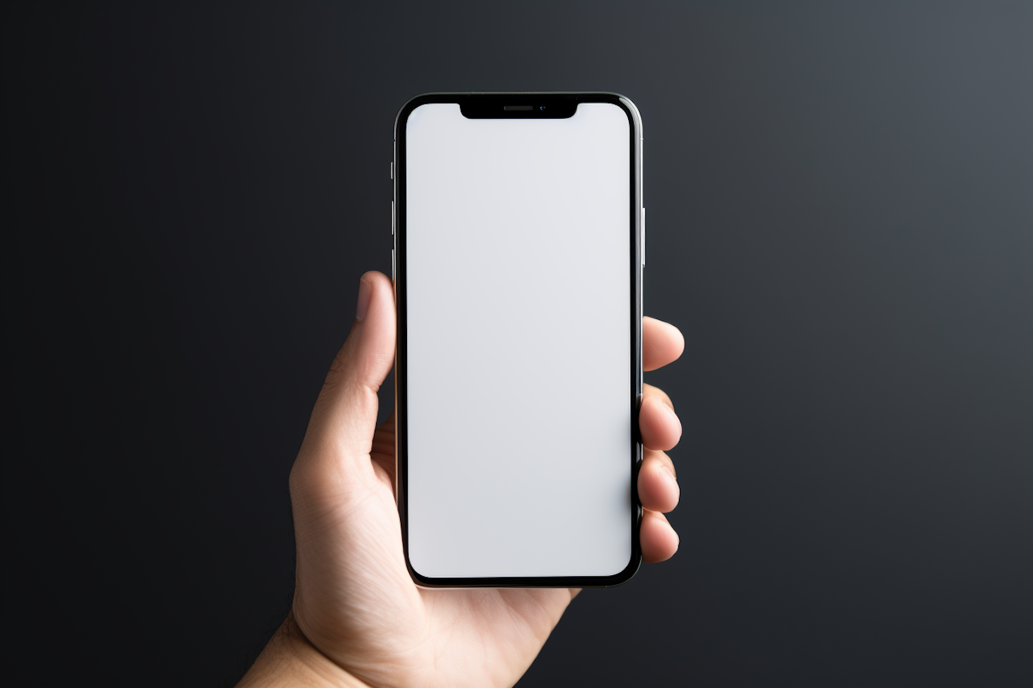 Hand holding a smartphone with a blank screen against a dark gray background, highlighting the phone's sleek design.