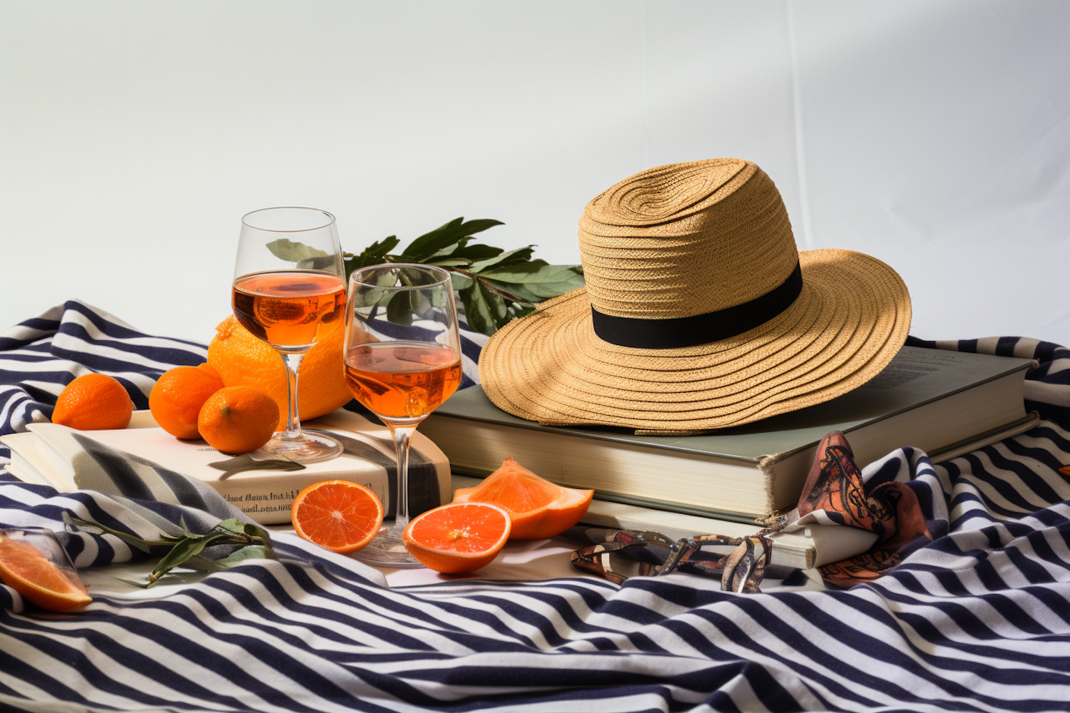 Straw hat, citrus fruits, and glasses of orange drink on striped fabric create a summery, relaxed vibe with books and sunglasses.