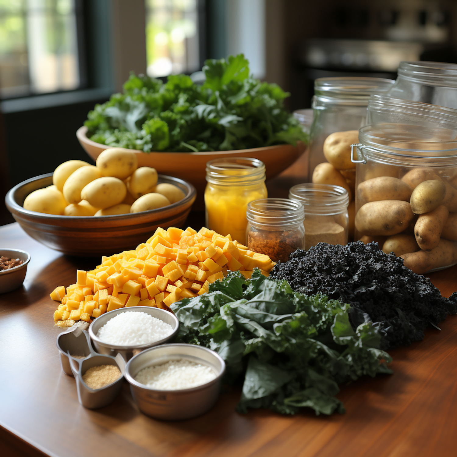 A vibrant display of fresh ingredients on a wooden table, featuring kale, potatoes, squash, and spices, ready for a healthy meal.