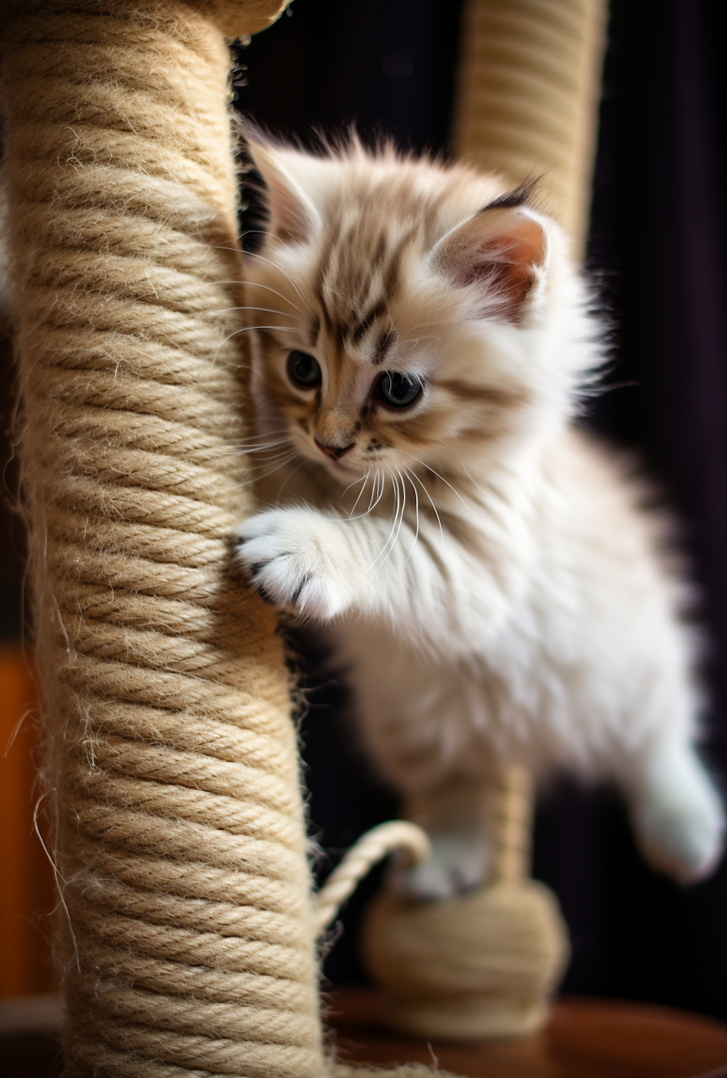 Adorable fluffy kitten climbing a sisal rope scratching post with focused eyes and playful energy.