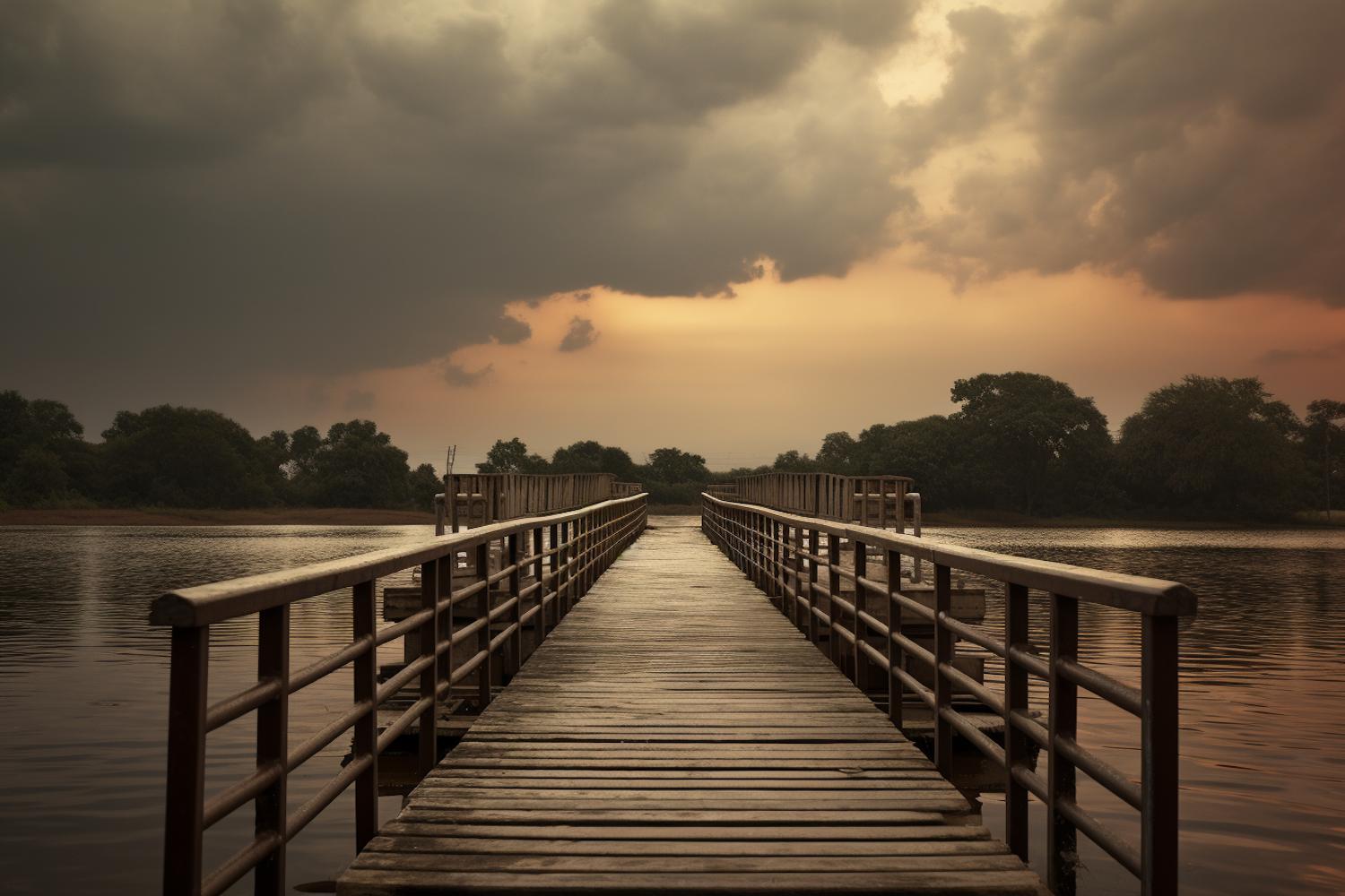 Dramatic pier scene with stormy clouds and golden light breaking through, reflecting on calm water. Serene yet tense atmosphere.