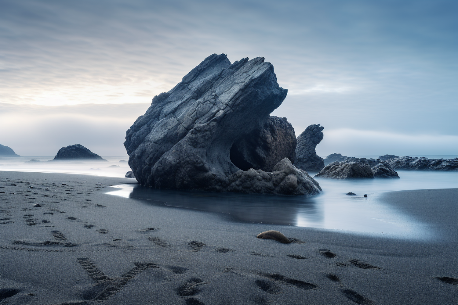 Tranquil coastal scene with rugged rocks, misty waves, and footprints in the sand under an overcast sky.