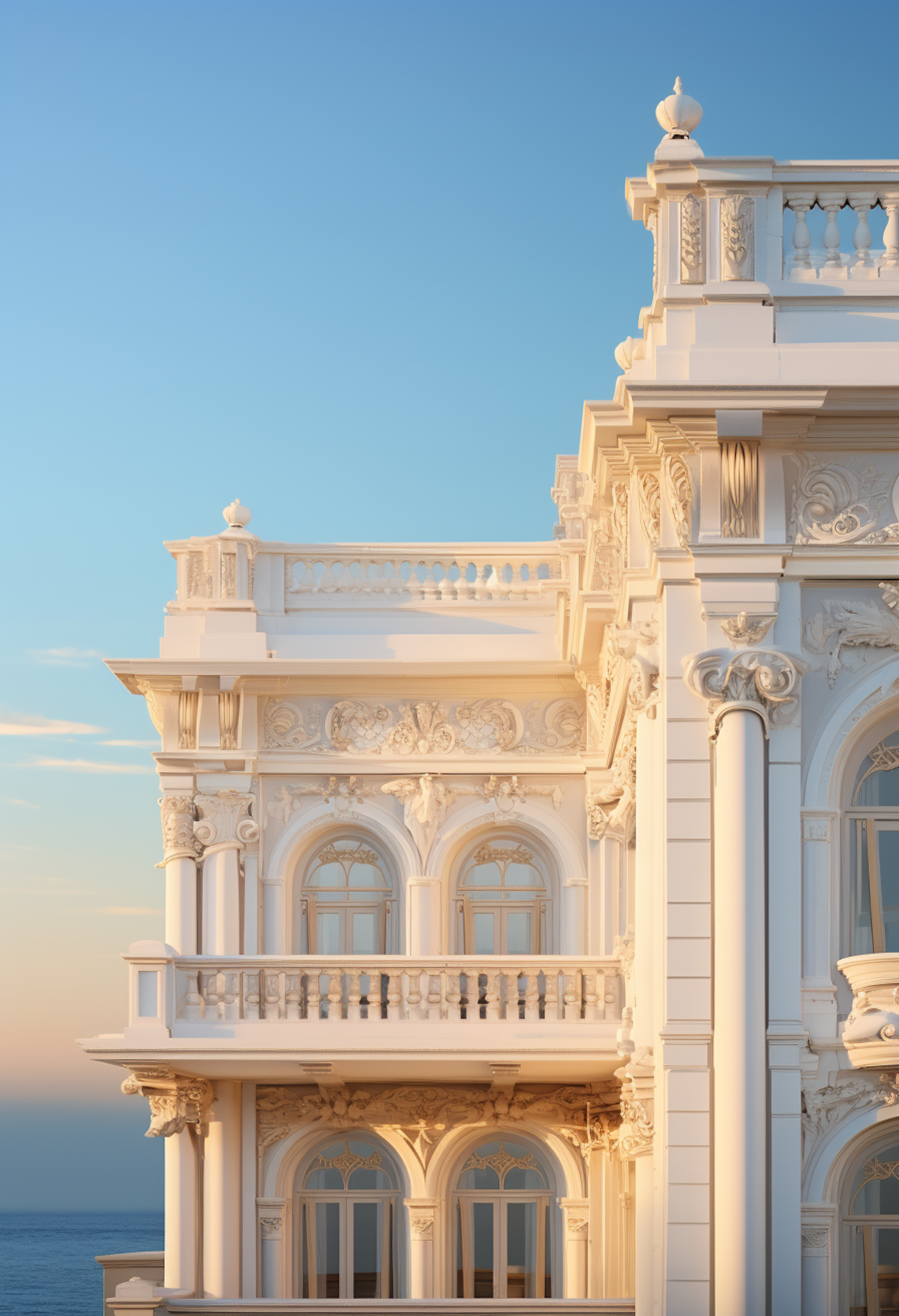 Ornate white building with intricate carvings and columns, set against a clear blue sky and ocean backdrop, bathed in warm sunlight.