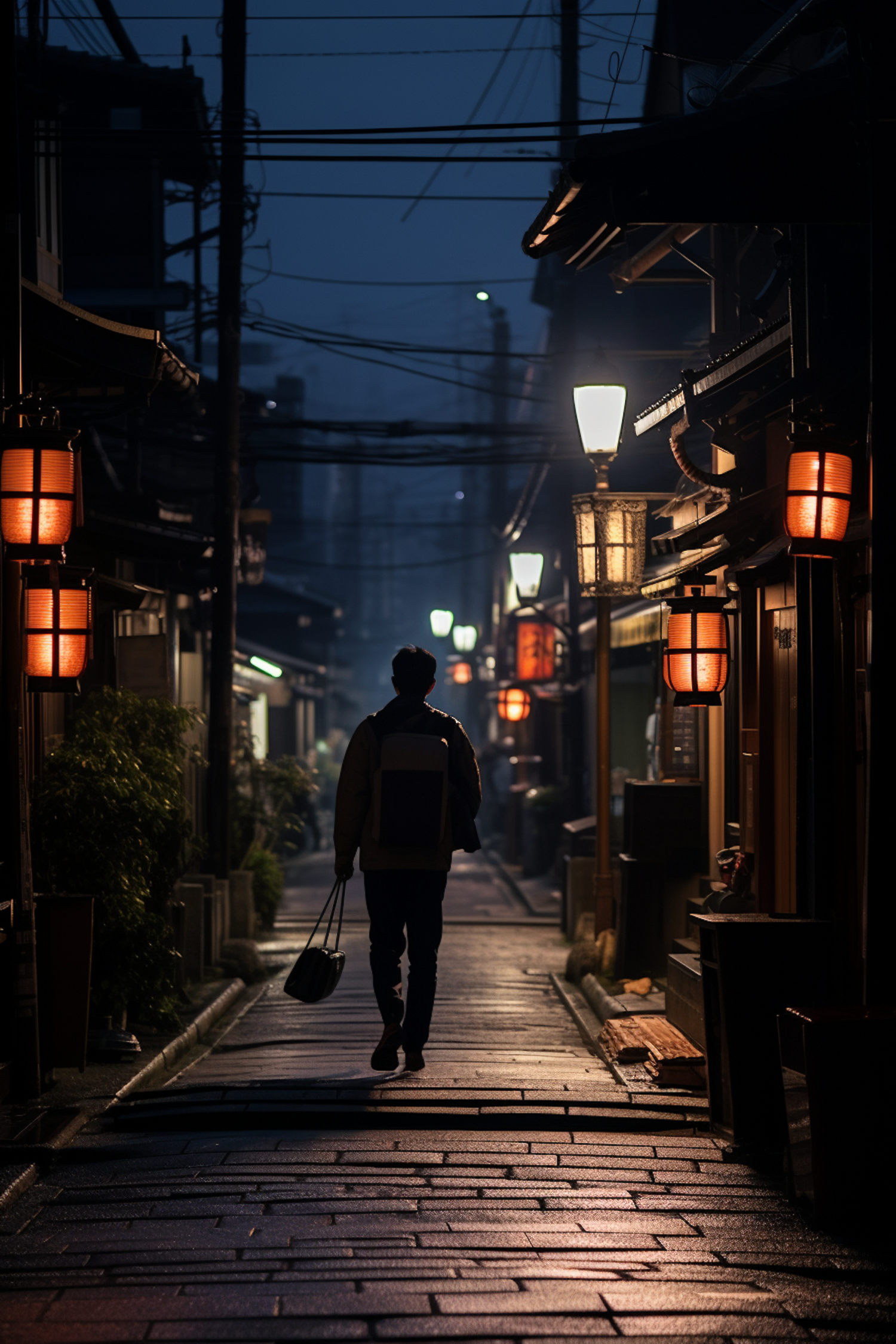 Silhouetted figure walks down a lantern-lit street at night, evoking a serene and traditional atmosphere.