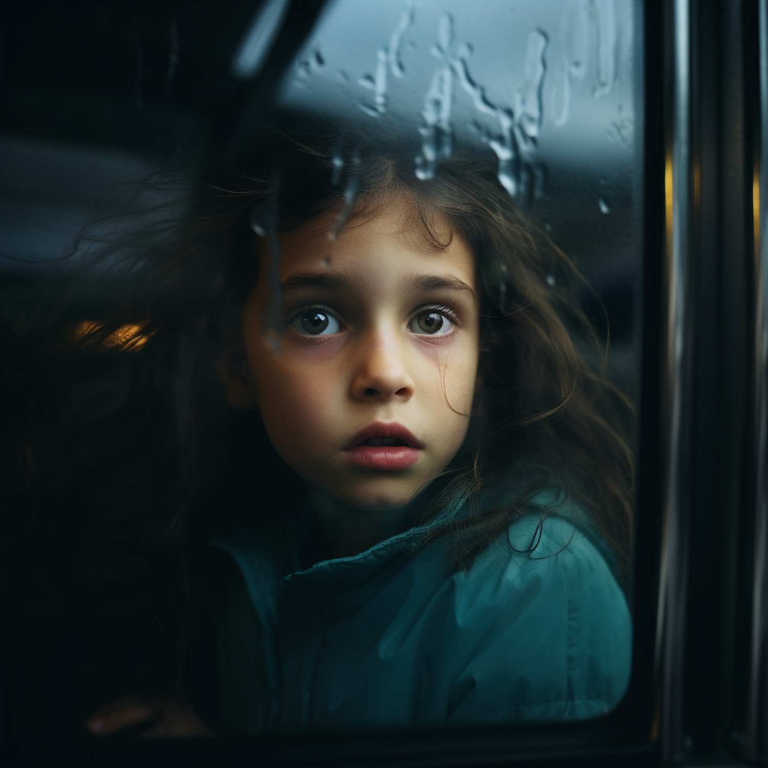 A young girl with green eyes and brown hair looks out a rain-streaked car window, wearing a teal jacket. Her expression is curious.