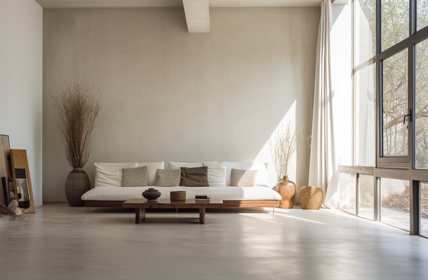 Minimalist living room with a wooden sofa, neutral decor, dried plants, and large windows letting in natural light.