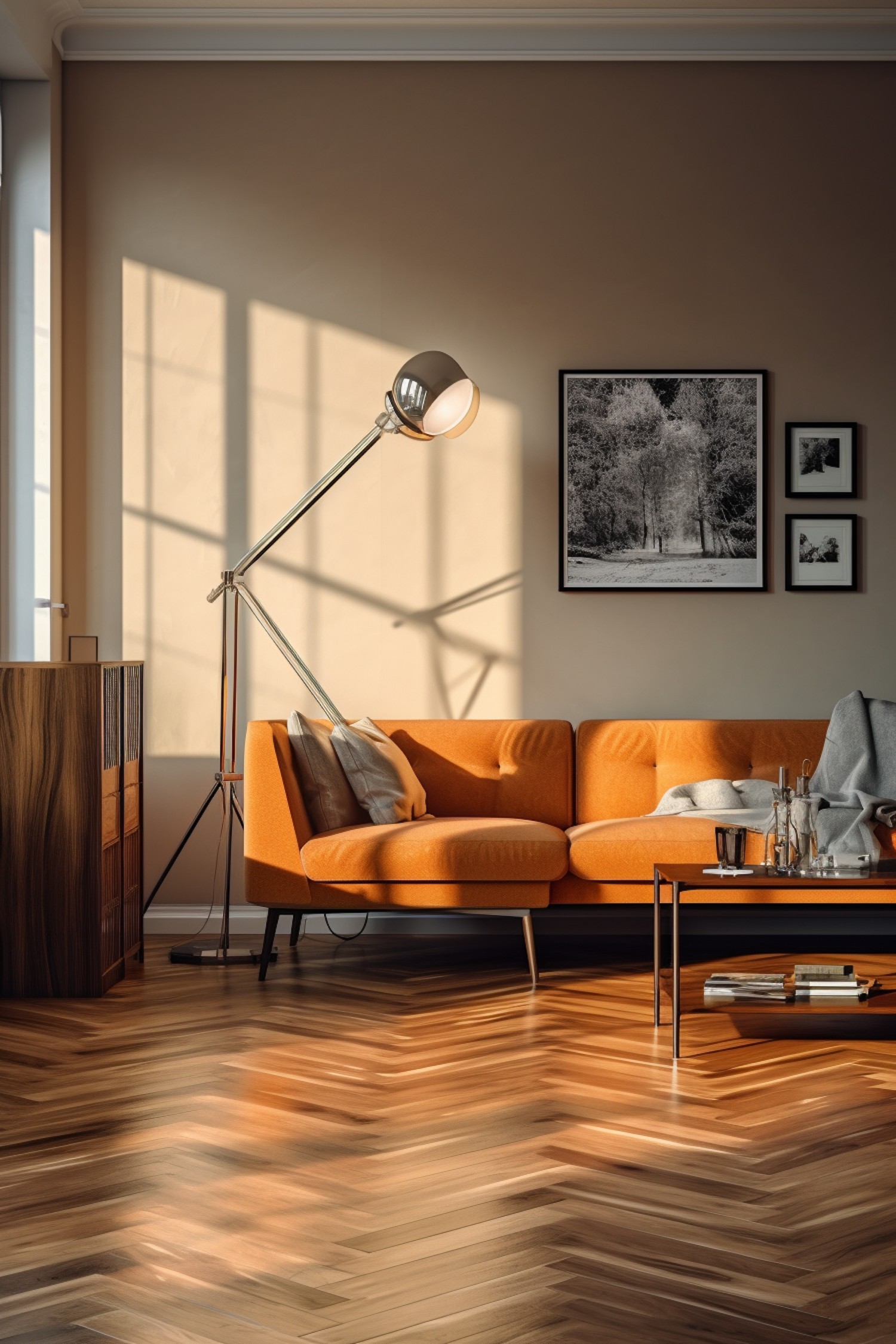 Warm living room with orange sofa, black-and-white photos, and a metallic floor lamp. Sunlit herringbone floor adds cozy ambiance.