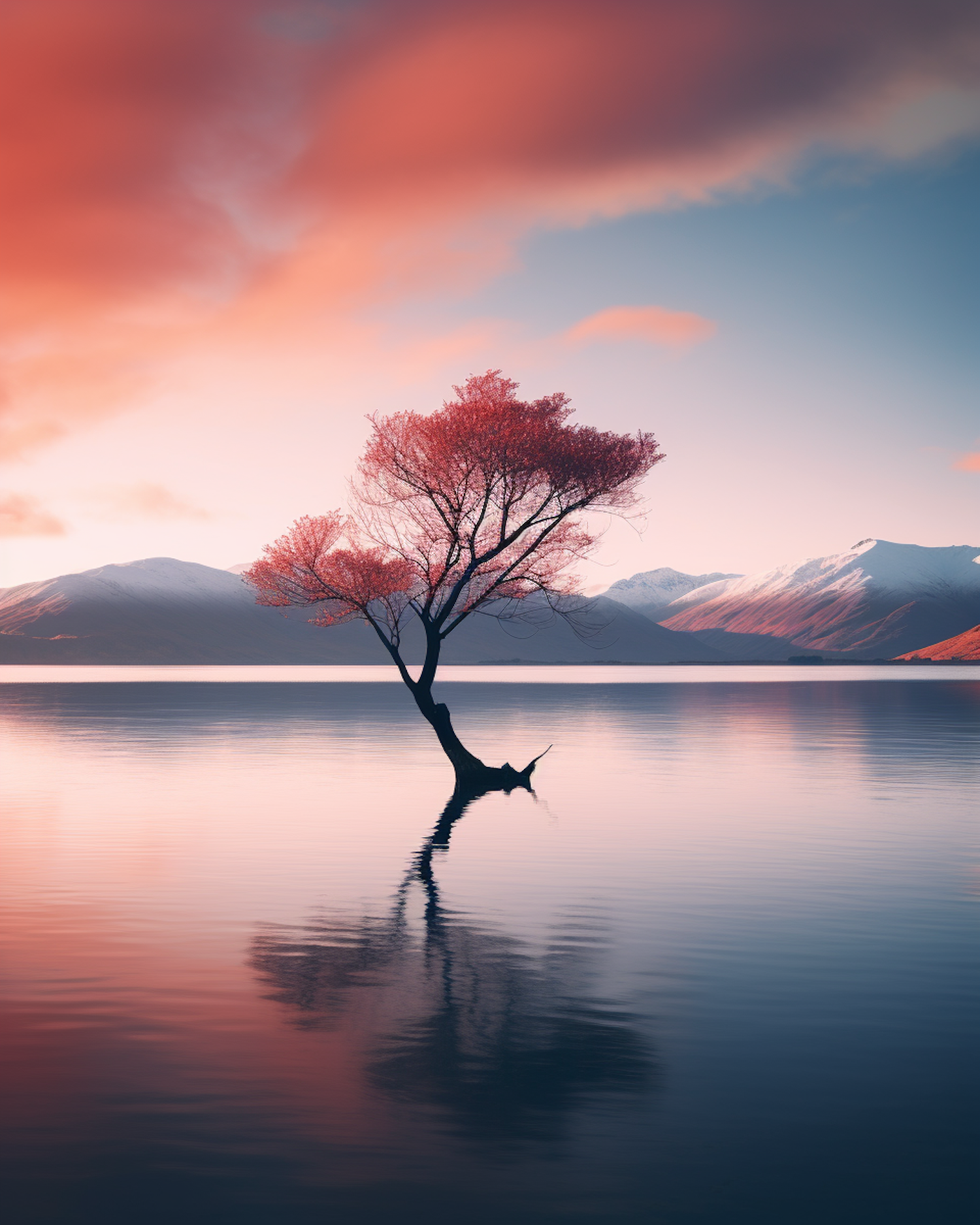 A serene lake scene with a solitary pink-blossomed tree, reflecting in calm waters, set against snow-capped mountains and a colorful sky.