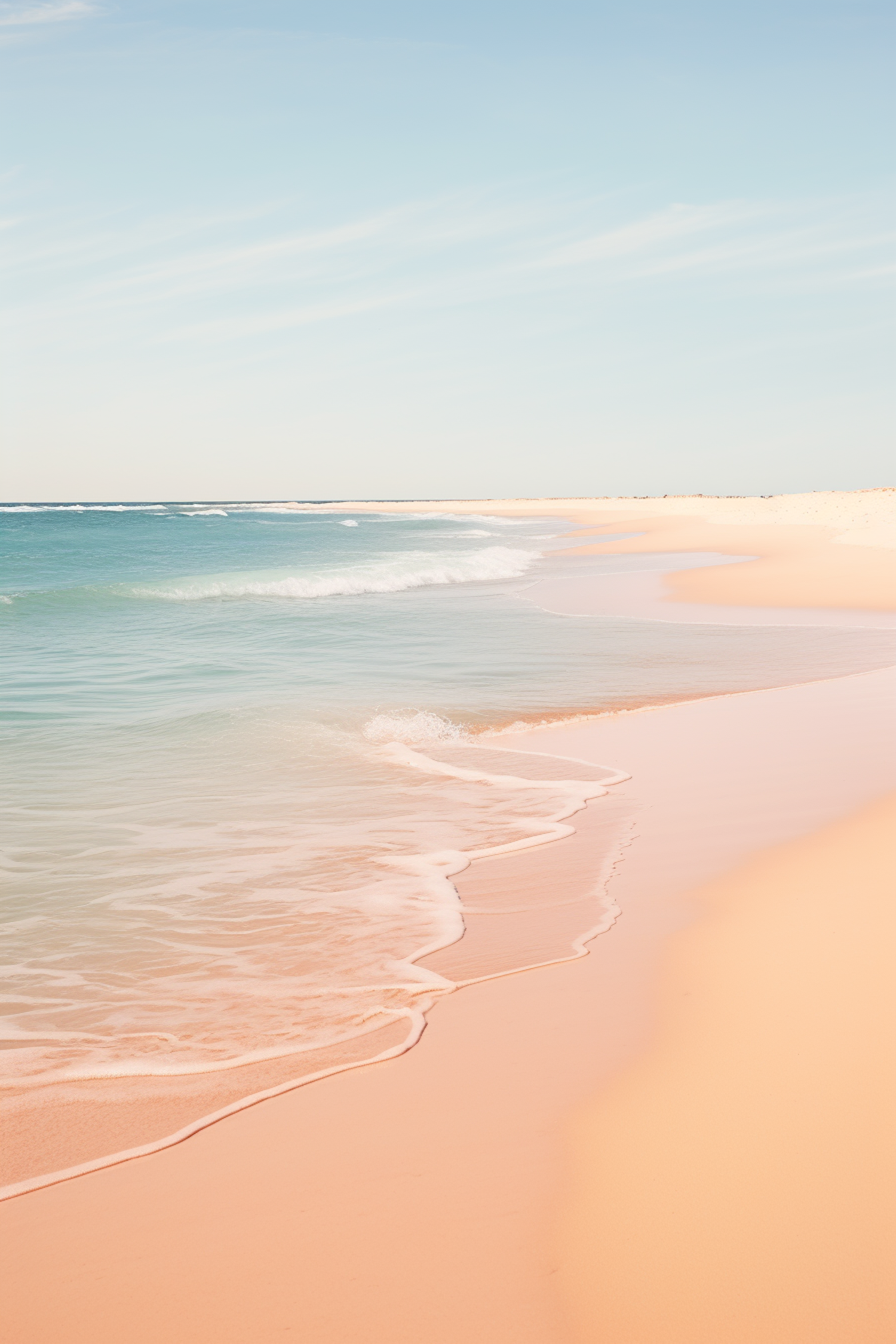 Tranquil beach with pastel sand and turquoise waves under a clear blue sky, creating a serene and inviting atmosphere.