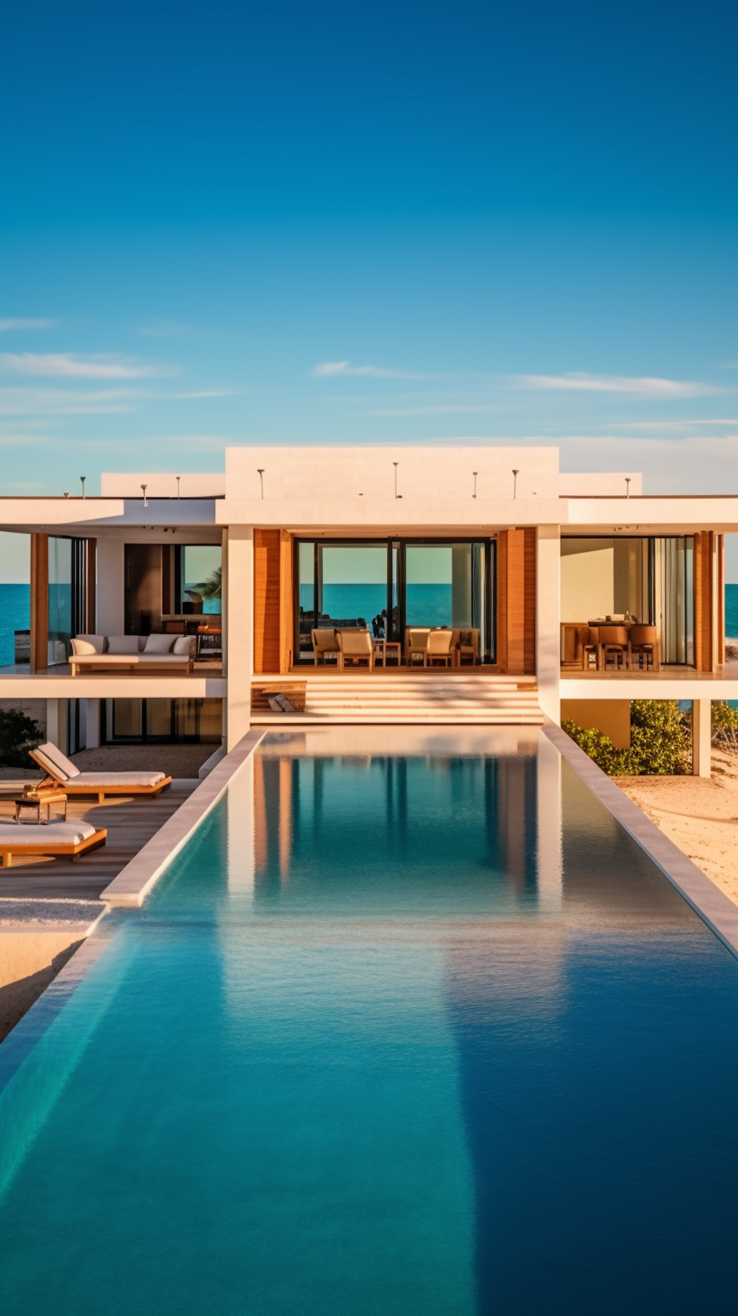 Luxurious modern villa with infinity pool, sleek architecture, and ocean view. Perfect for relaxation and elegance.