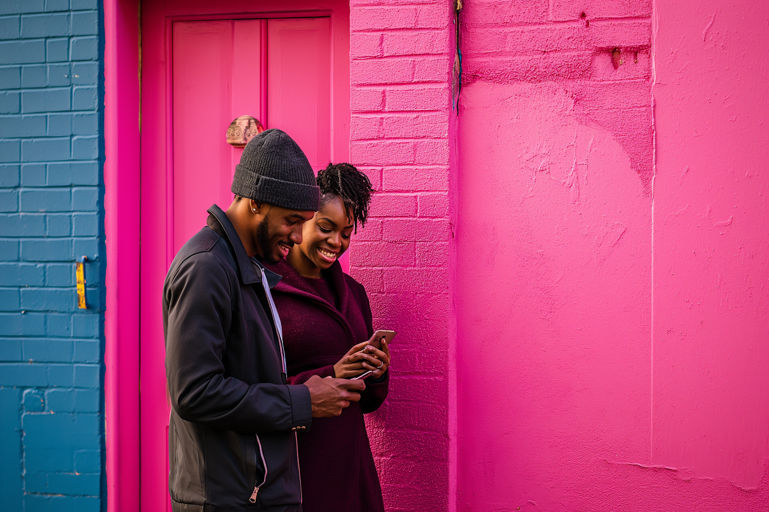 A young couple smiles at a smartphone against a vibrant pink wall, with contrasting blue door, creating a lively and cheerful scene.