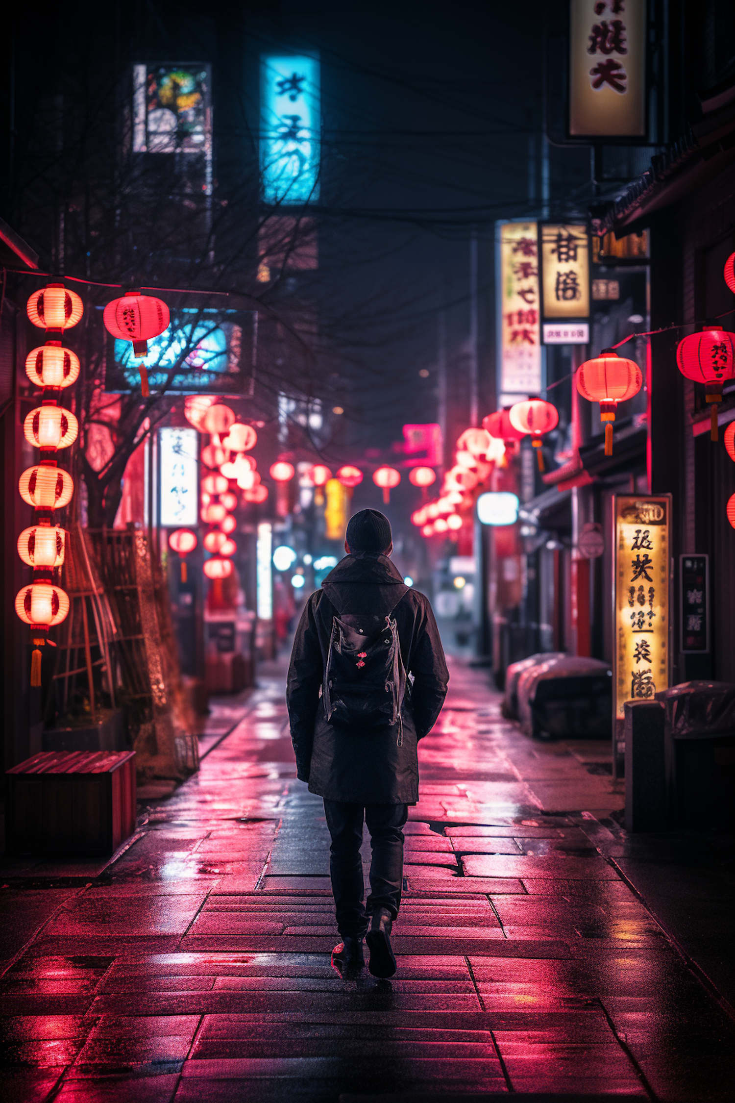 A solitary figure walks through a neon-lit Japanese street adorned with red lanterns, reflecting on wet pavement for a moody, atmospheric vibe.