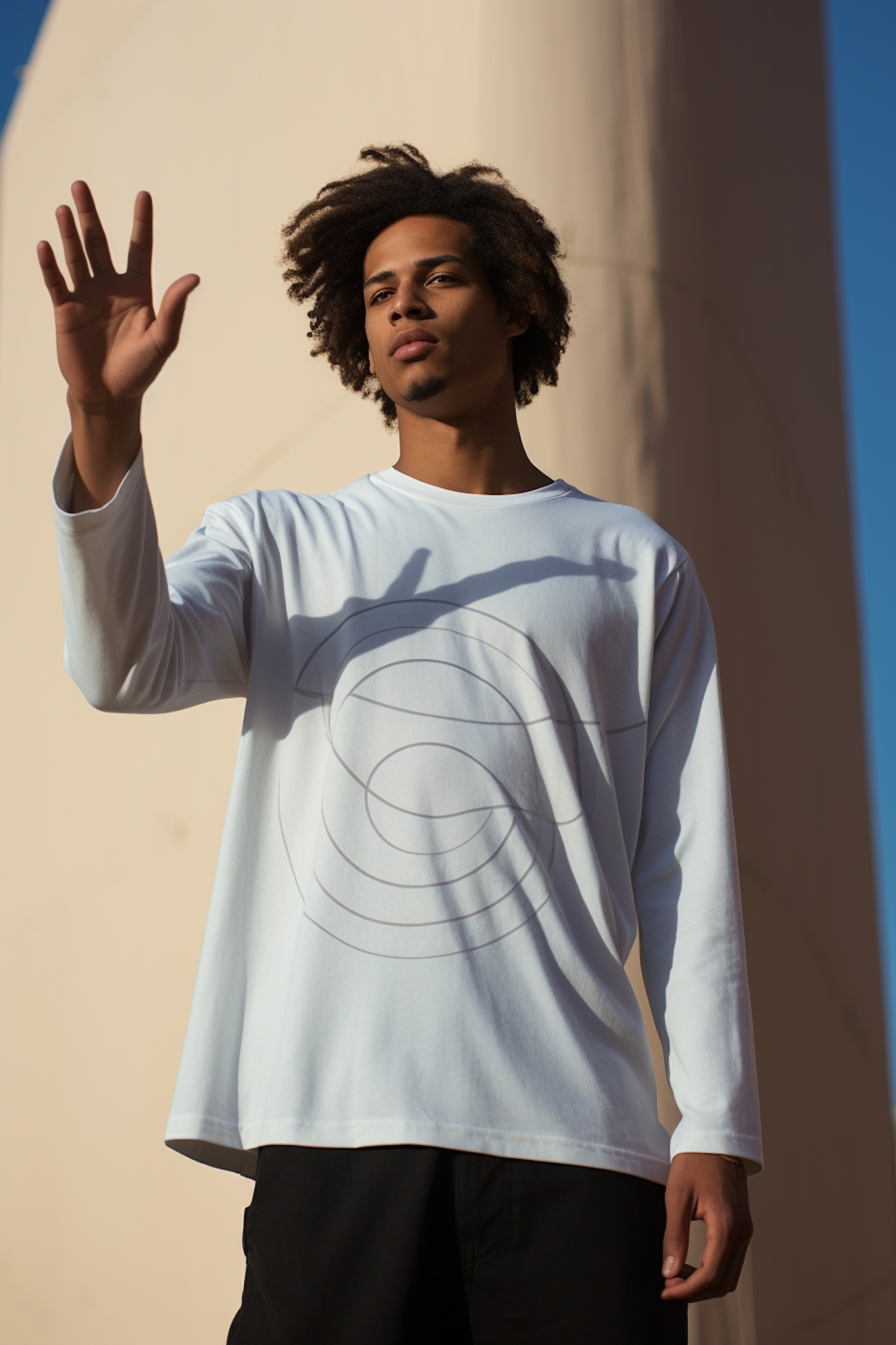 Young man in a white shirt with circular design, raising hand against a modern architectural backdrop and clear blue sky.
