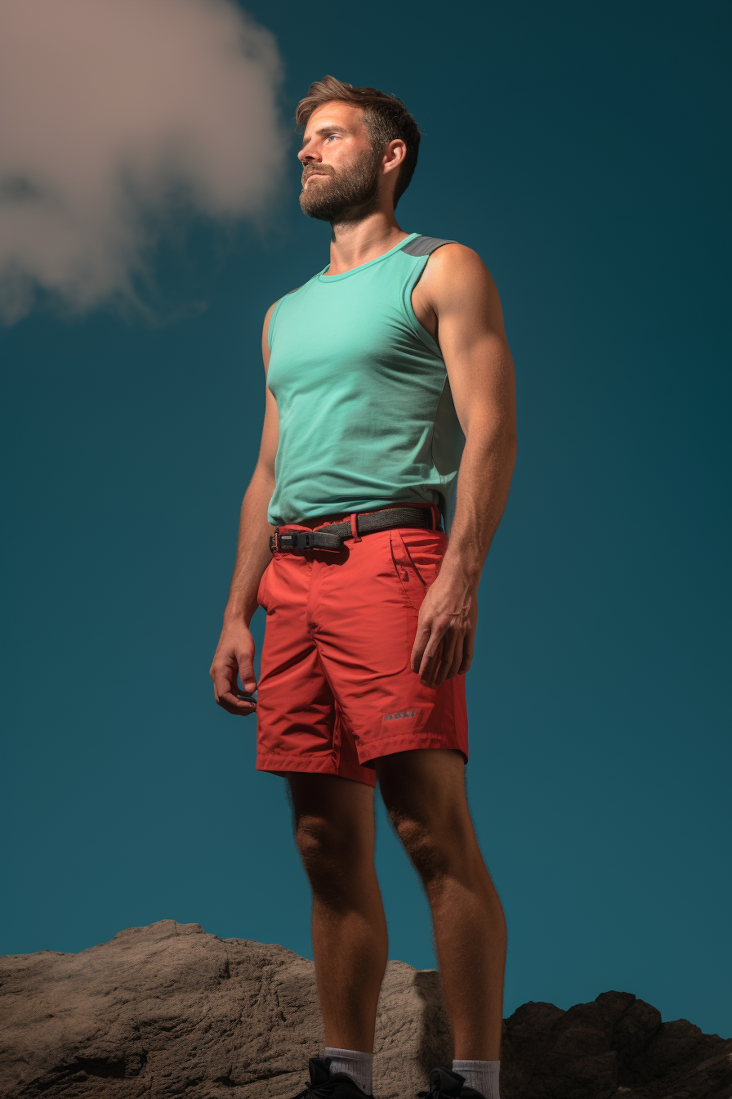 Athletic man in turquoise tank top and red shorts stands confidently against a blue sky, exuding strength and adventure.