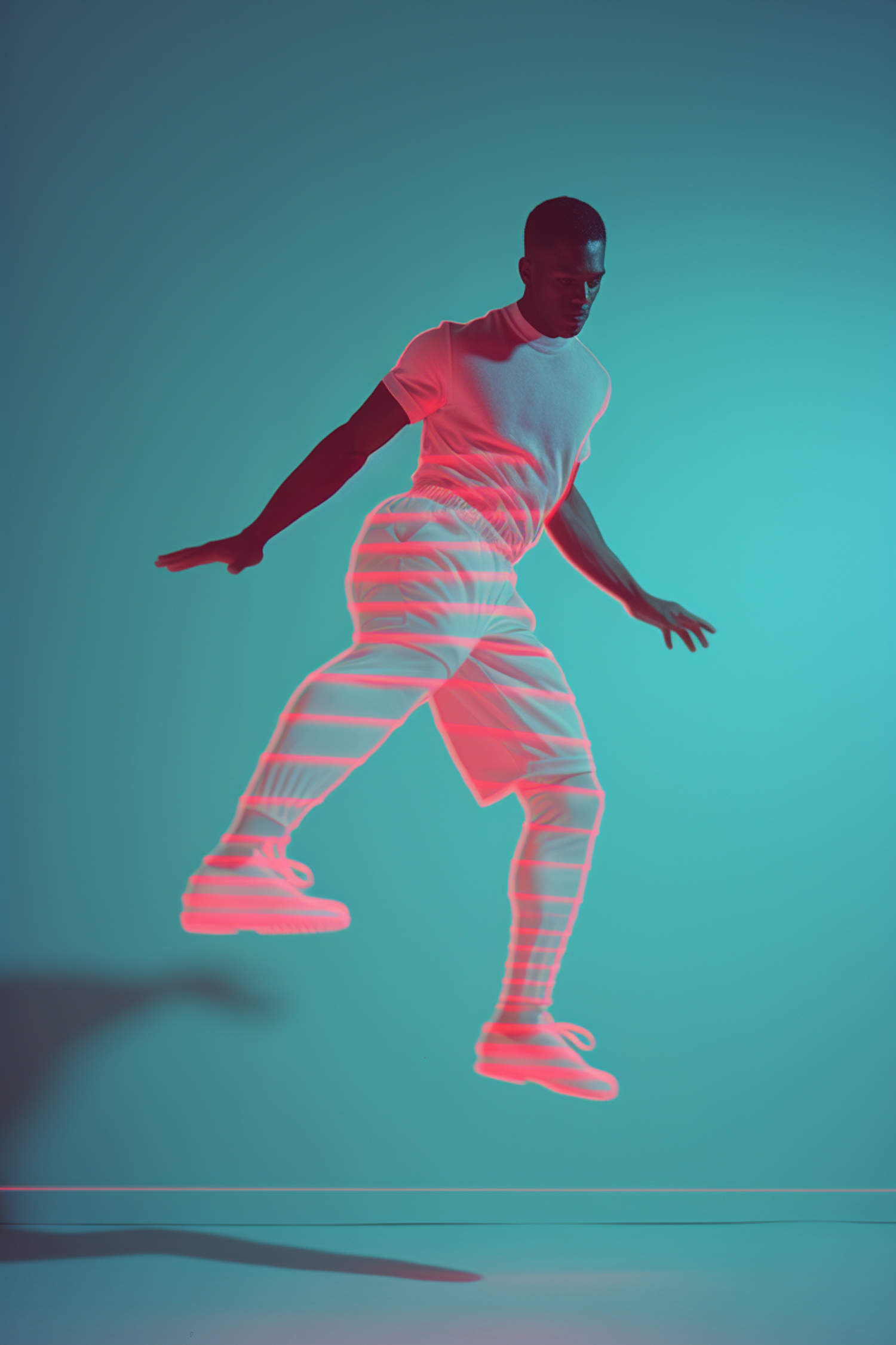 Dynamic shot of a man mid-air with neon red outline against a teal background, creating a futuristic and energetic vibe.
