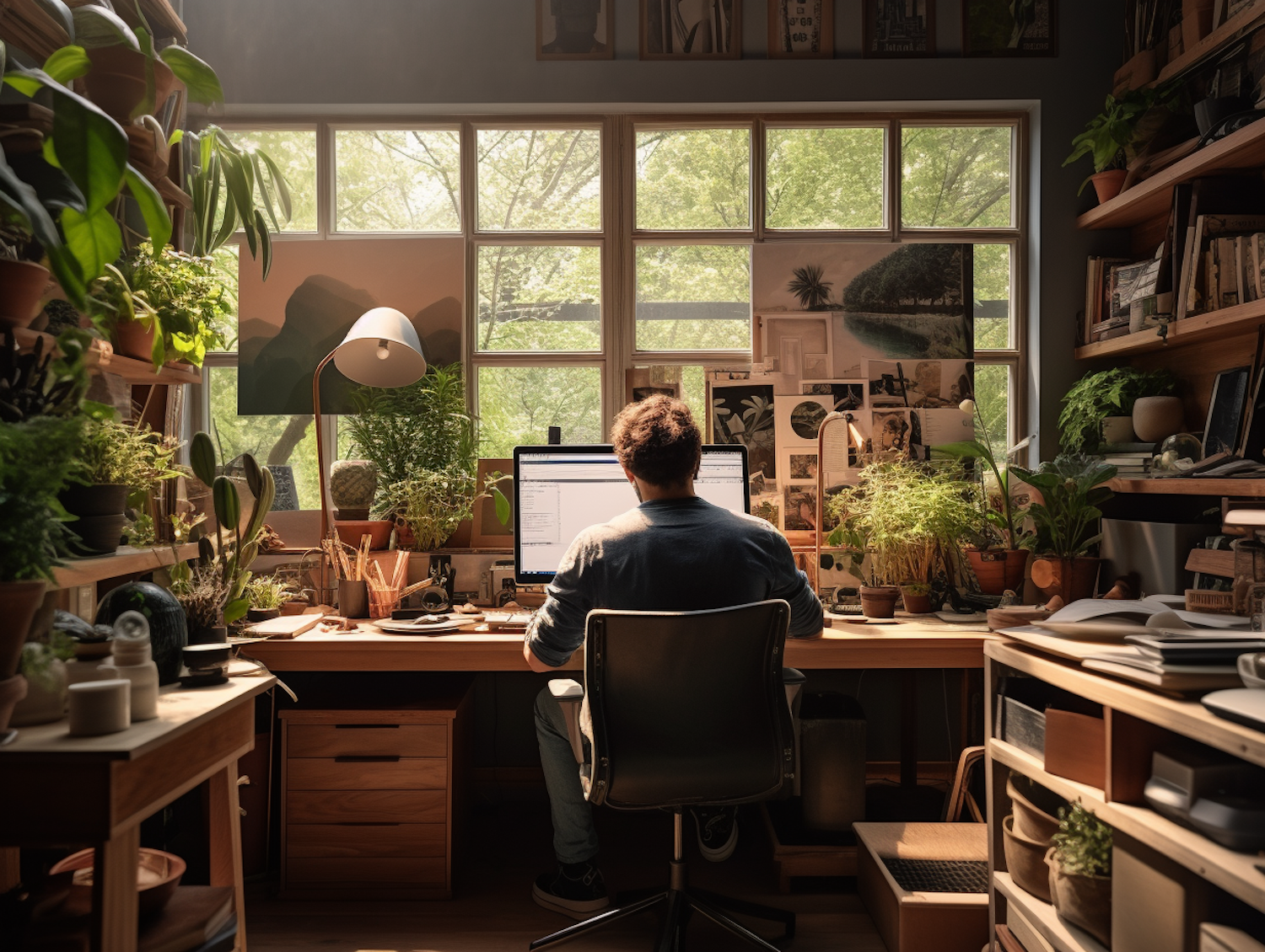 Cozy home office with lush plants, natural light, and a person working at a desk. Warm, inspiring atmosphere for creativity.