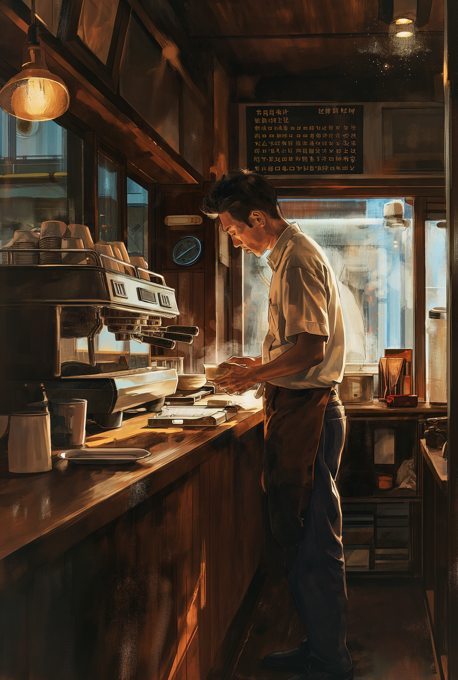 A barista in a cozy coffee shop prepares a cup of coffee, surrounded by warm lighting and rustic decor.