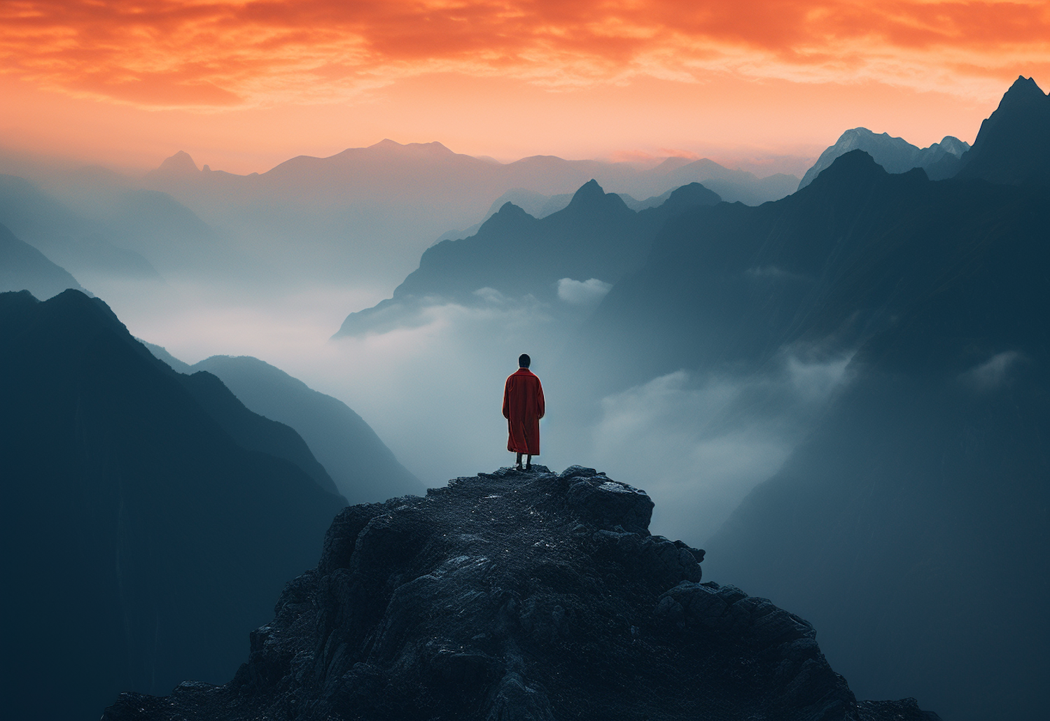 A lone figure in a red robe stands on a misty mountain peak, surrounded by dramatic orange skies and distant, foggy valleys.