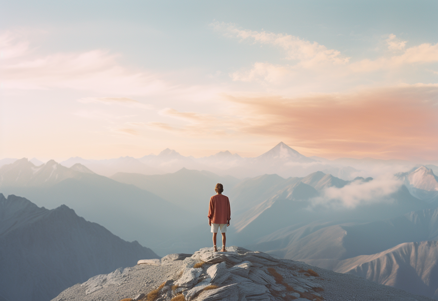 A person stands on a mountain peak, overlooking misty mountains under a pastel sky, creating a serene and contemplative scene.