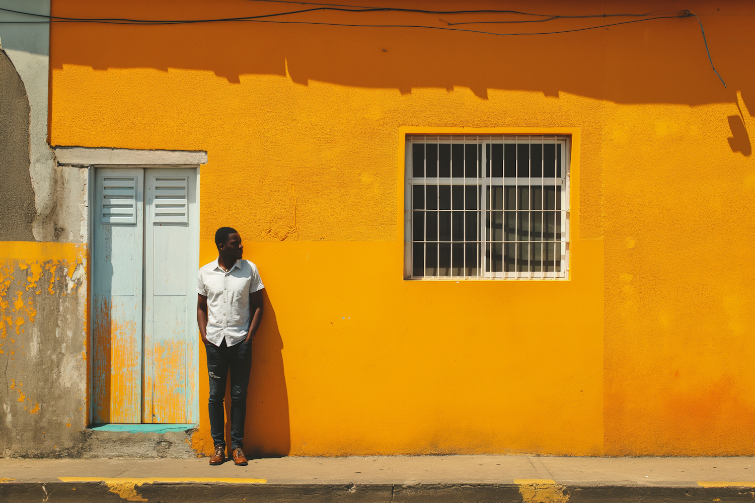 Man in white shirt stands against a vibrant yellow wall with a blue door and barred window, creating a striking urban scene.