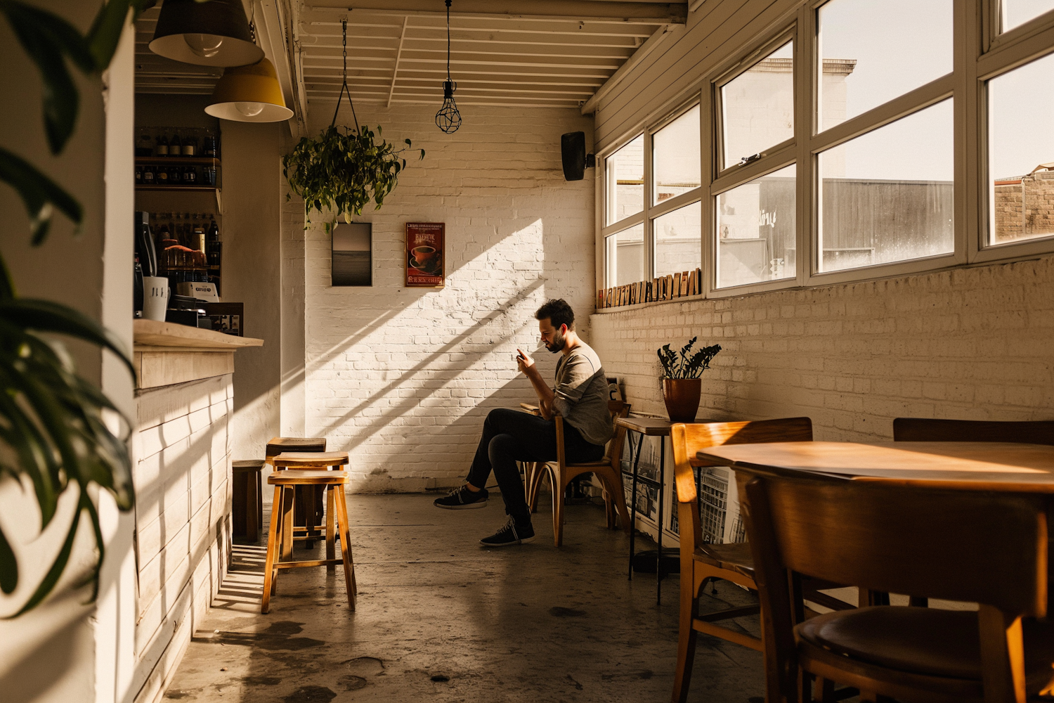 A man in a sunlit cafe, absorbed in his phone, surrounded by warm wooden decor and lush greenery.