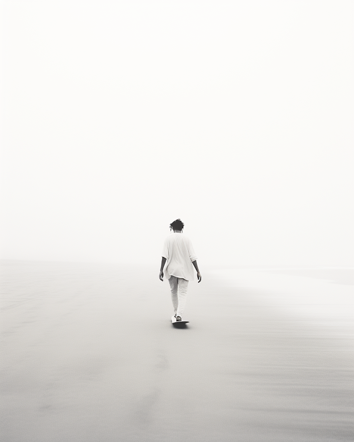 A solitary figure in white walks on a misty beach, creating a serene and ethereal atmosphere with muted tones and soft reflections.
