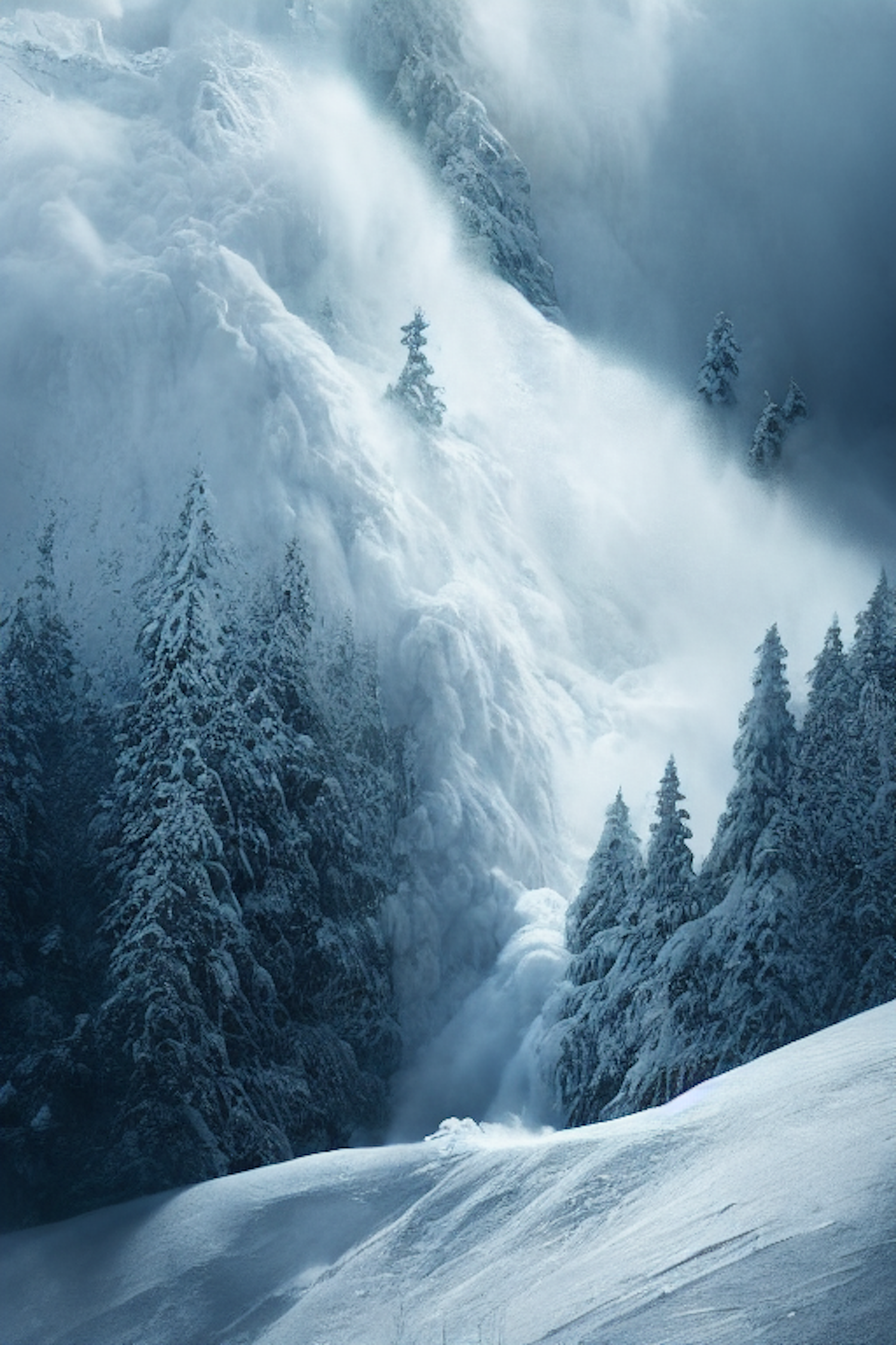 A breathtaking avalanche cascades down a snowy mountain, surrounded by snow-laden evergreens under a gray sky.