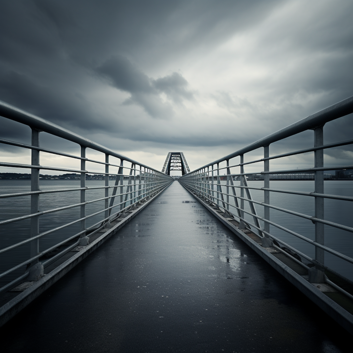 Moody bridge scene with wet surface and dramatic clouds, leading to a distant arch. Gray and blue tones create a tranquil atmosphere.