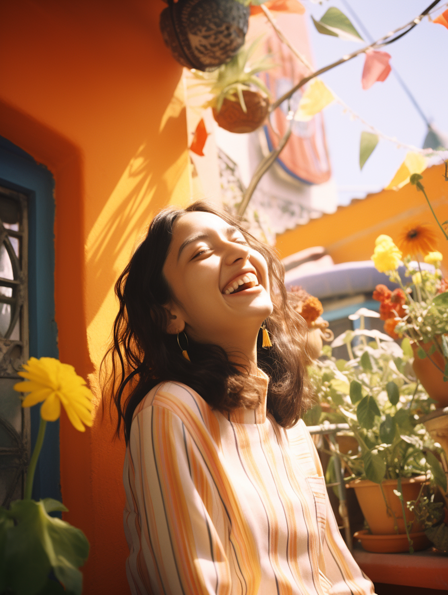 Joyful woman laughing in a colorful garden with bright flowers and sunlight casting playful shadows.