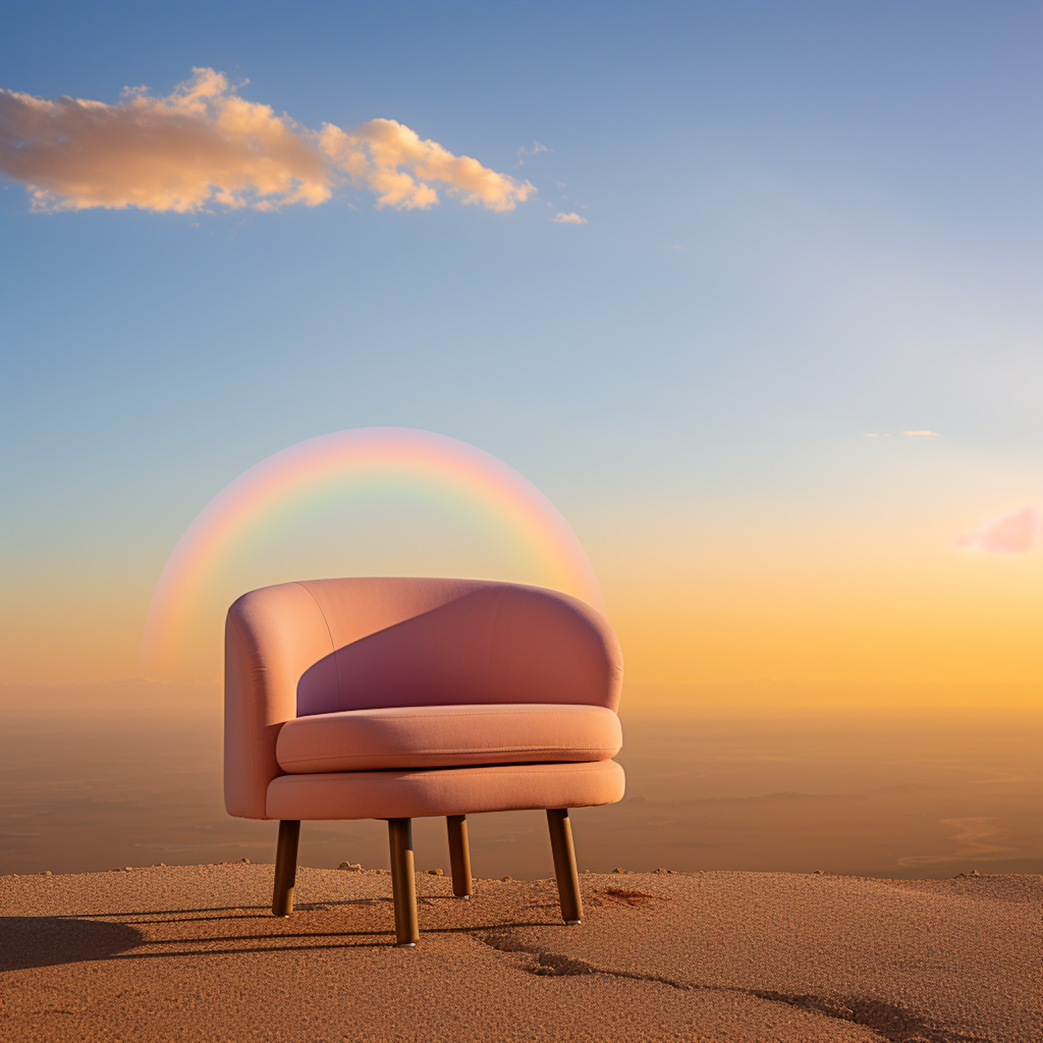 Pastel pink armchair on a desert-like surface with a rainbow and sunset sky, creating a whimsical and serene scene.