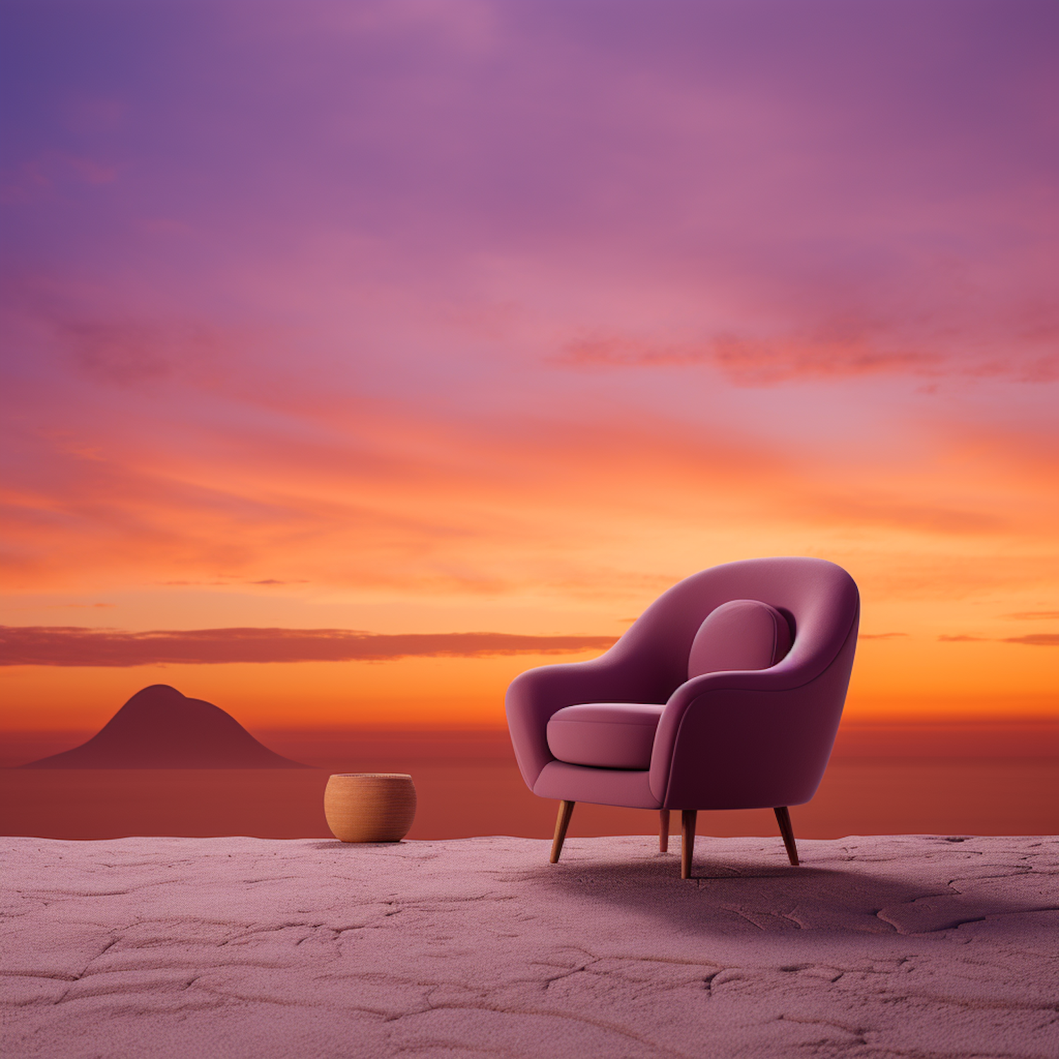 Purple armchair on cracked desert floor with sunset hues and mountain silhouette, paired with a wicker basket for a serene aesthetic.