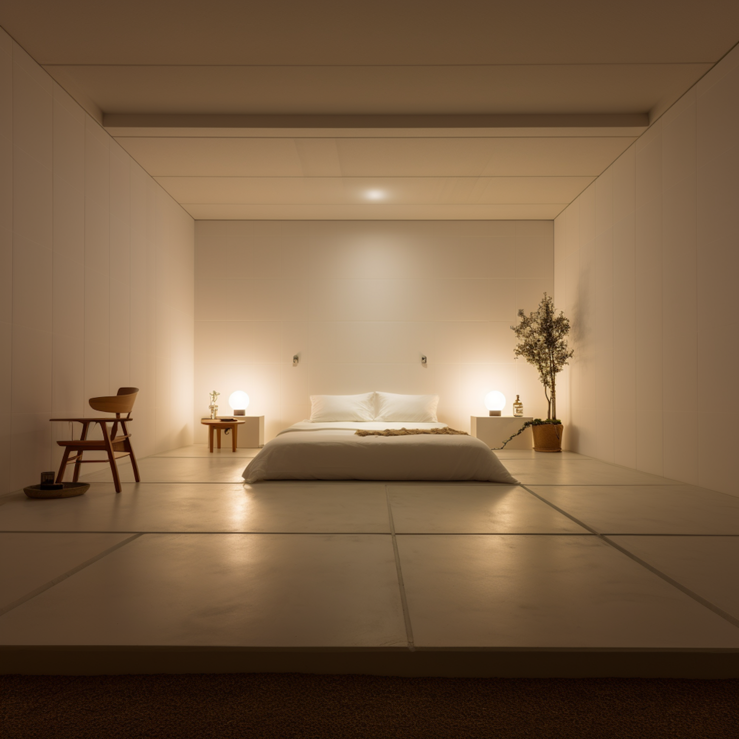 Minimalist bedroom with a low white bed, warm lighting, and natural elements like a wooden chair and potted plant.