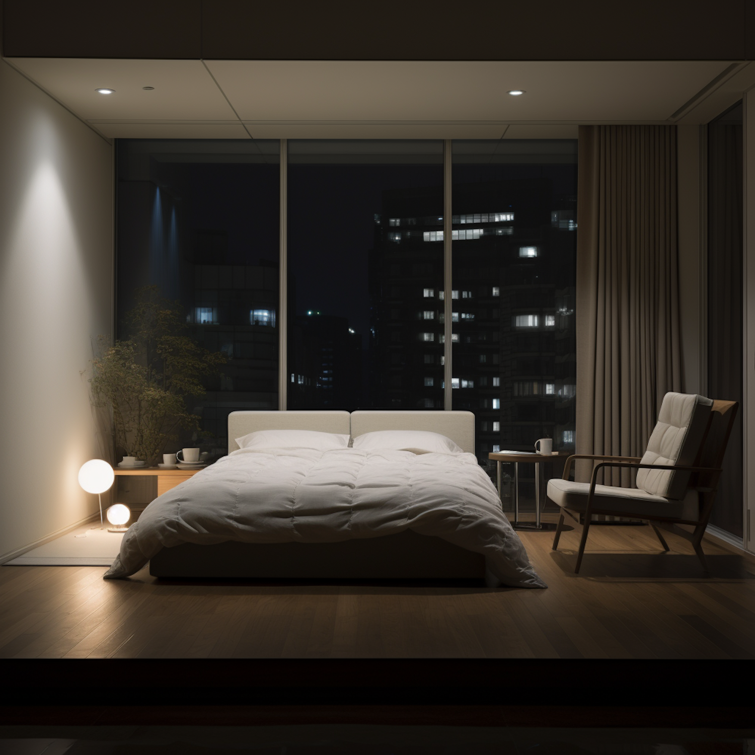 Modern bedroom with minimalist design, featuring a large bed, soft lighting, and a nighttime cityscape view through large windows.