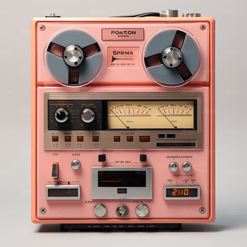Vintage pink reel-to-reel tape recorder with silver accents, featuring dials, VU meters, and foreign language labels for a retro aesthetic.